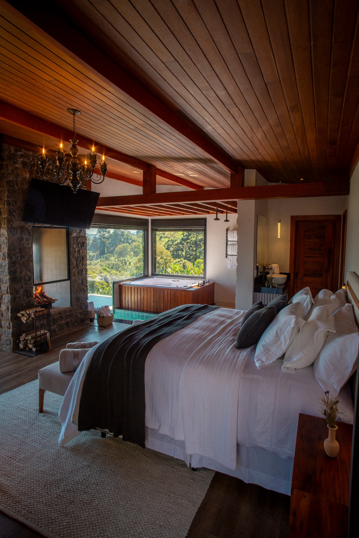 Nosso chalé conta com vista panorâmica frontal para a cachoeira, varanda, cama Queen-size, roupas de cama e banho, banheira de hidromassagem, roupões, banheiro privativo com torneira e chuveiro aquecido. A lareira, com lenha incluso no pacote, proporciona um ambiente acolhedor. O espaço inclui uma mesa com duas cadeiras, frigobar, micro-ondas e minicozinha equipada com utensílios. Além disso, o chalé oferece internet Wi-Fi e uma TV-Smart de 43 polegadas com acesso a Netflix.