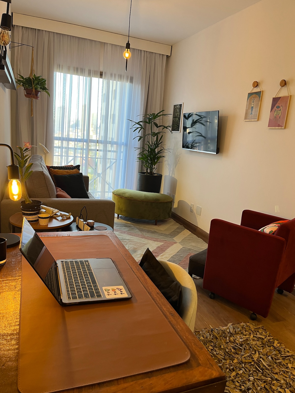 Stylish 50 m² apt. located at Bela Vista, has 24hr doorman. 2 bedrooms (only 1 with AC, and queen bed, the second one is quite small and can be used as an office, fitting a double-sized sofa-bed) and 1 bathroom. With amazing views from every window, it is a great place to work and relax. The private jet-tube at the balcony is a fantastic spot to enjoy the city views. Ideal for couples, professionals or small families looking for comfort, convenience, and one of the best views in the city.
