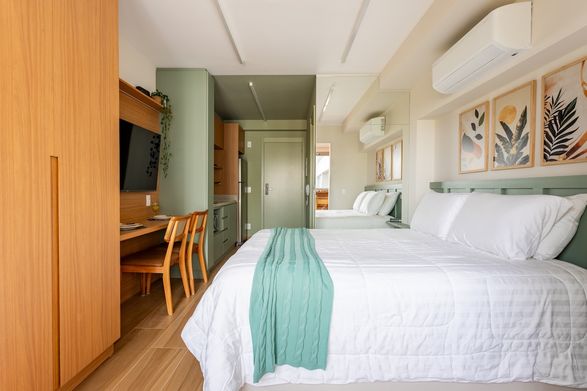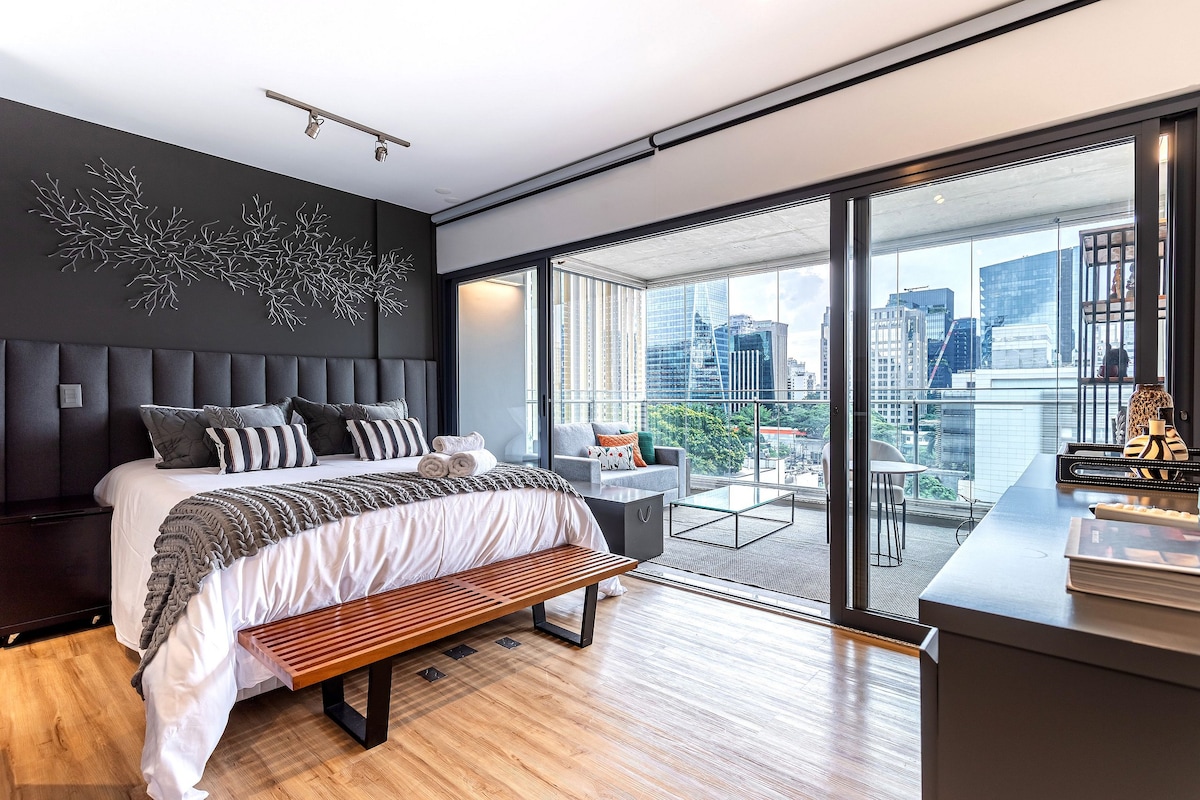 Experience One Eleven in Vila Olimpia. This modern apartment features large windows with breathtaking city views and natural light. The unit boasts 600 Mbps internet and a 4K HD TV. For total comfort, it has a Hot/Cold AC system: 27,000 BTU/h unit in the living room and 10,000 BTU/h in the bedroom. The bedroom is quiet and dark for a restful sleep. Impeccably maintained, you’ll be walking distance to top restaurants and business hubs—a safe, upscale retreat with a stunning urban backdrop.