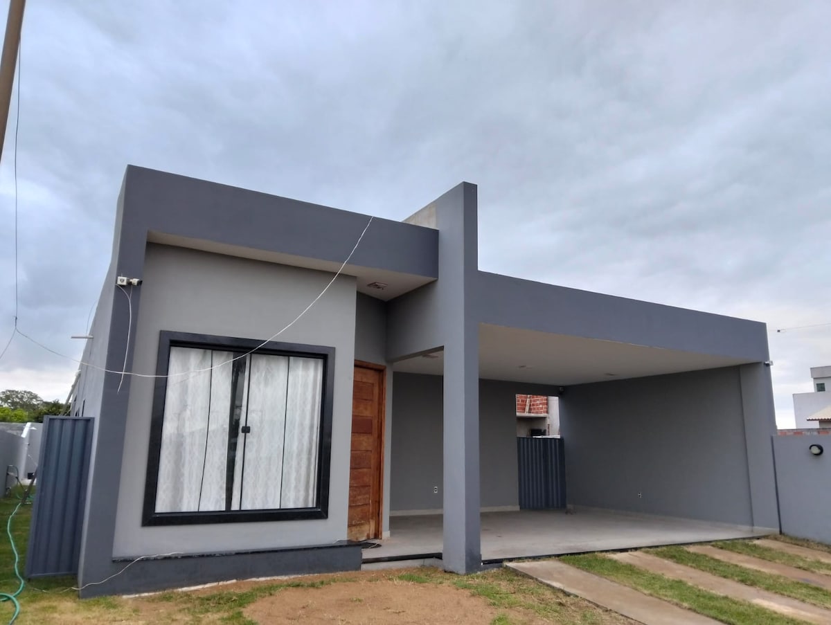 Casa nova de alto padrão, composta por 2 quartos com ar-condicionado, cozinha completa, sala, um banheiro, área de serviço e área gourmet, piscina, chuveirão e garagem para 2 carros. Todos eletrodomésticos novos. Casa conectada com Wi-Fi.