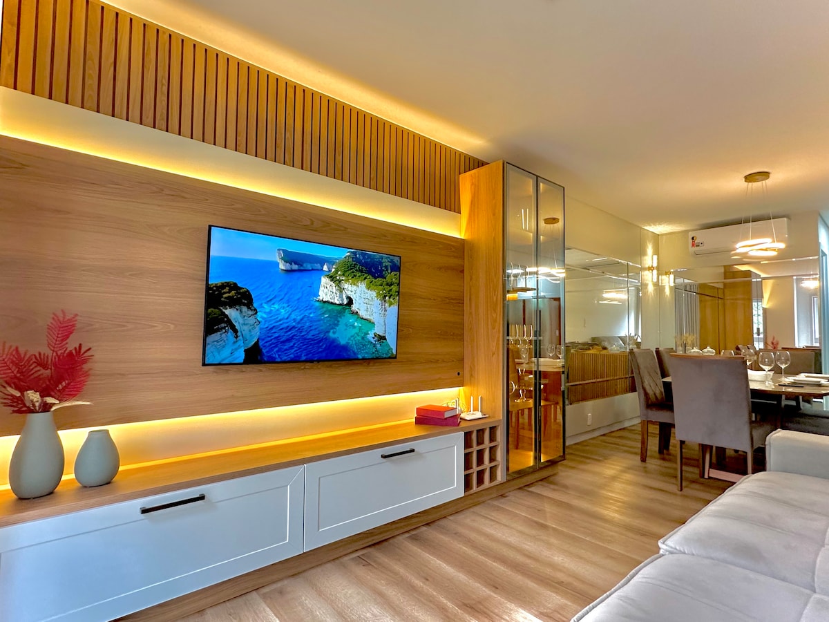 Perfeito para casais e famílias que buscam conforto e tranquilidade em um espaço amplo e cheio de charme! Wi-Fi de fibra, 2 Garagens, Sacada fechada com Churrasqueira, Lareira ecológica, Smart TV 55' e 32' c/ Netflix, Disney Plus e Amazon Prime, Colchões Premium, Chuveiros TOP, área de serviço individual com Máquina de Lavar, aquecimento de água nos ambientes, Ar Condicionado Q/F nos quartos e sala, cozinha completa e equipada, um espaço para café e localizado em um local arborizado e silencioso