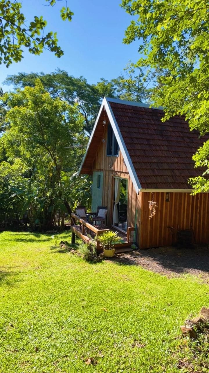 Estamos à 4,3 Km (7min) do centro da cidade. Localizada no sitio junto a nossa casa na Linha Ávila Alta 2090, percurso todo asfaltado. A casa é construída artesanalmente, com teto verde e amplo jardin. Acomoda 4 pessoas, 2 adultos e 2 crianças,1 quarto (cama de casal e sofá cama), 1 banheiro, cozinha equipada com frigobar, fogão, microondas, cafeteira elétrica, grill e utensilhos. Roupas de cama e banho também são disponibilizadas, além de conectividade WI-FI.