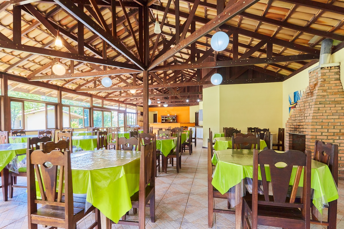 Você vai adorar se hospedar nesse recanto tranquilo e charmoso podendo usufruir de uma bela piscina e área de festas. Quarto convencional com banheiro compartilhado. Casa pet friendly com vários bichinhos. @cabanacarambu
