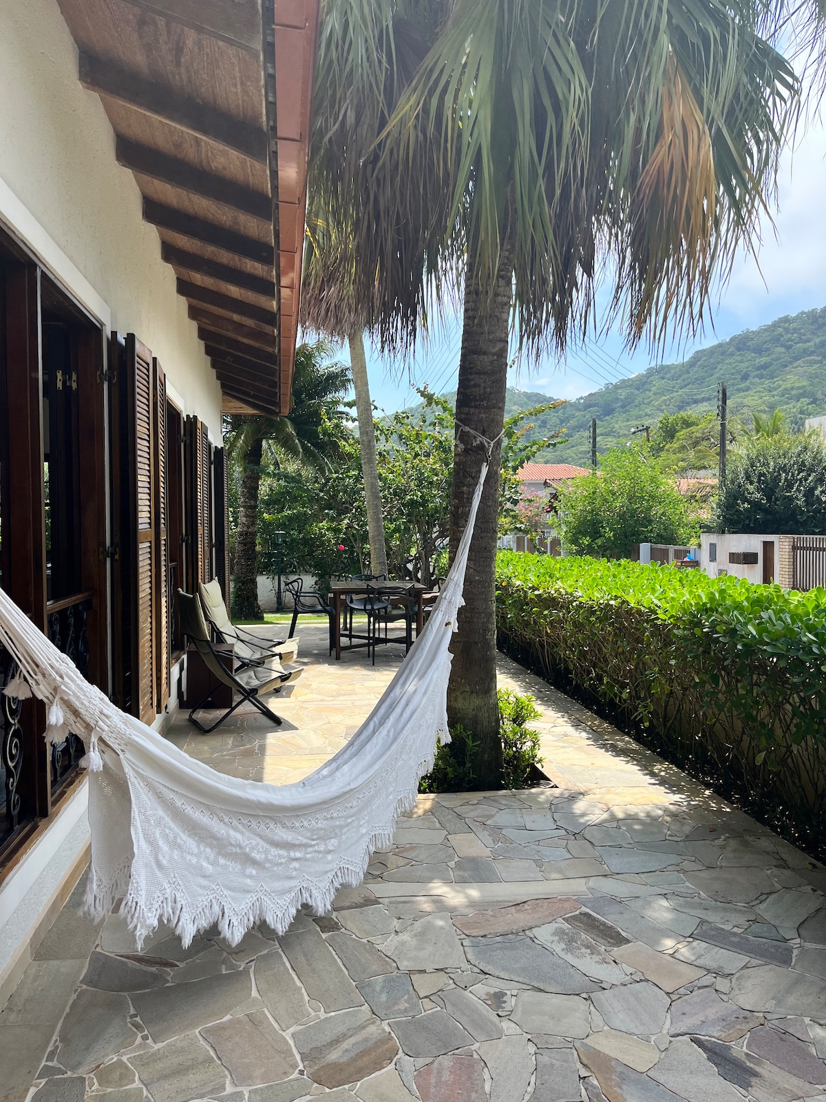 A casa é boa para casais, famílias (com crianças) e grandes grupos. Fica em um grande terreno gramado e a 50 metros da praia. Ampla área interna, possui varanda na frente e lateral da casa com churrasqueira e ganchos para redes. É também boa para pets, há uma casinha e área com portão nos fundos para prender os cães quando necessário.