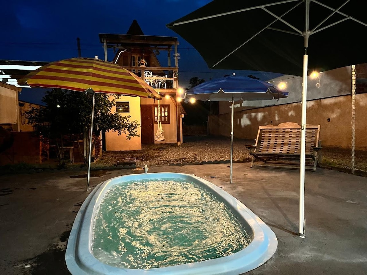 Divirta-se com toda a família neste lugar cheio de estilo, o sobrado para 10 pessoas compoe uma decoração boho praiana, remete a colonia portuguesa com toque moderno. Possui piscina com cascata privativa, bem como é possível utilizar a piscina compartilhada da pousada. Possui área privativa cercada incluindo estacionamento e área de churrasco privativa. Há 50 mts do mar, no balneário mais seletivo de Itapoá, tendo mercado, farmácia, padaria, frutaria, churrascaria e lanchonetes nas proximidades