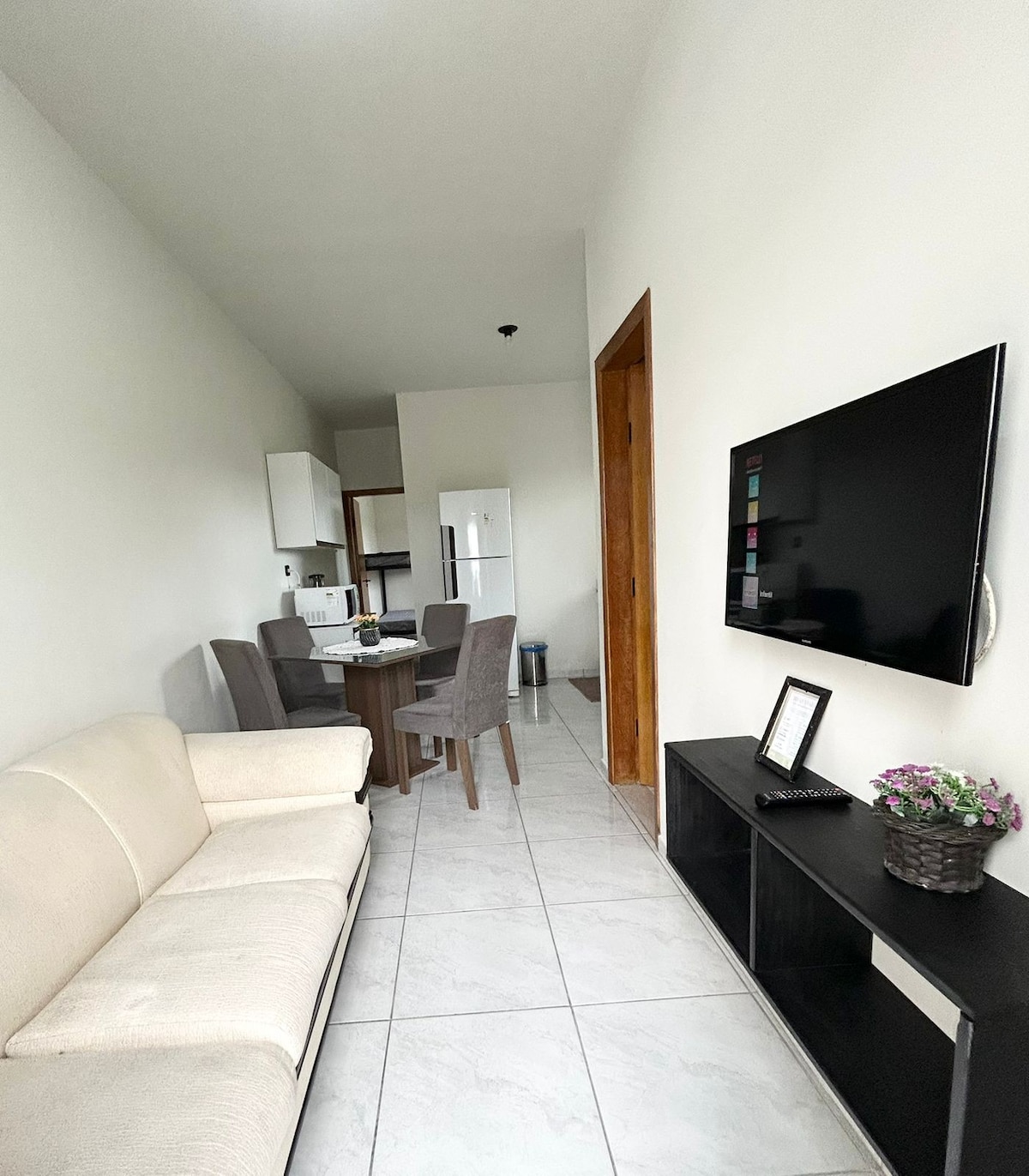 Apto em lugar tranquilo com todos equipamentos necessários . 1 quarto com cama de casal e1 bicama condicionado. Banheiro completo, cozinha equipada com micro ondas, geladeira, fogão tv e armários cafeteira liquidicador mesa e cadeiras ventilador . divisora entre cama de casal e bicama .Piscina compartilhada, churrasqueira. Não são fornecidos roupas de cama e mesa apt p/ 4 pessoas. wi-fi