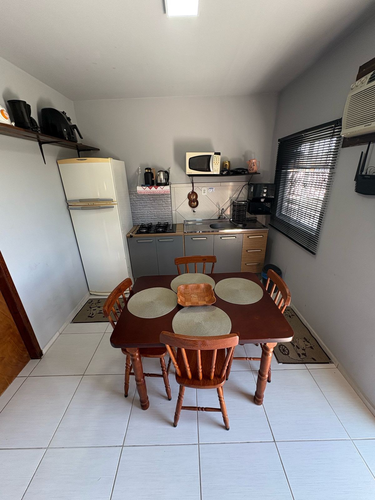 Apto em lugar tranquilo com todos equipamentos necessários . 1 quarto com cama de casal e1 bicama condicionado. Banheiro completo, cozinha equipada com micro ondas, geladeira, fogão tv e armários cafeteira liquidicador mesa e cadeiras ventilador . divisora entre cama de casal e bicama .Piscina compartilhada, churrasqueira. Não são fornecidos roupas de cama e mesa apt p/ 4 pessoas. wi-fi