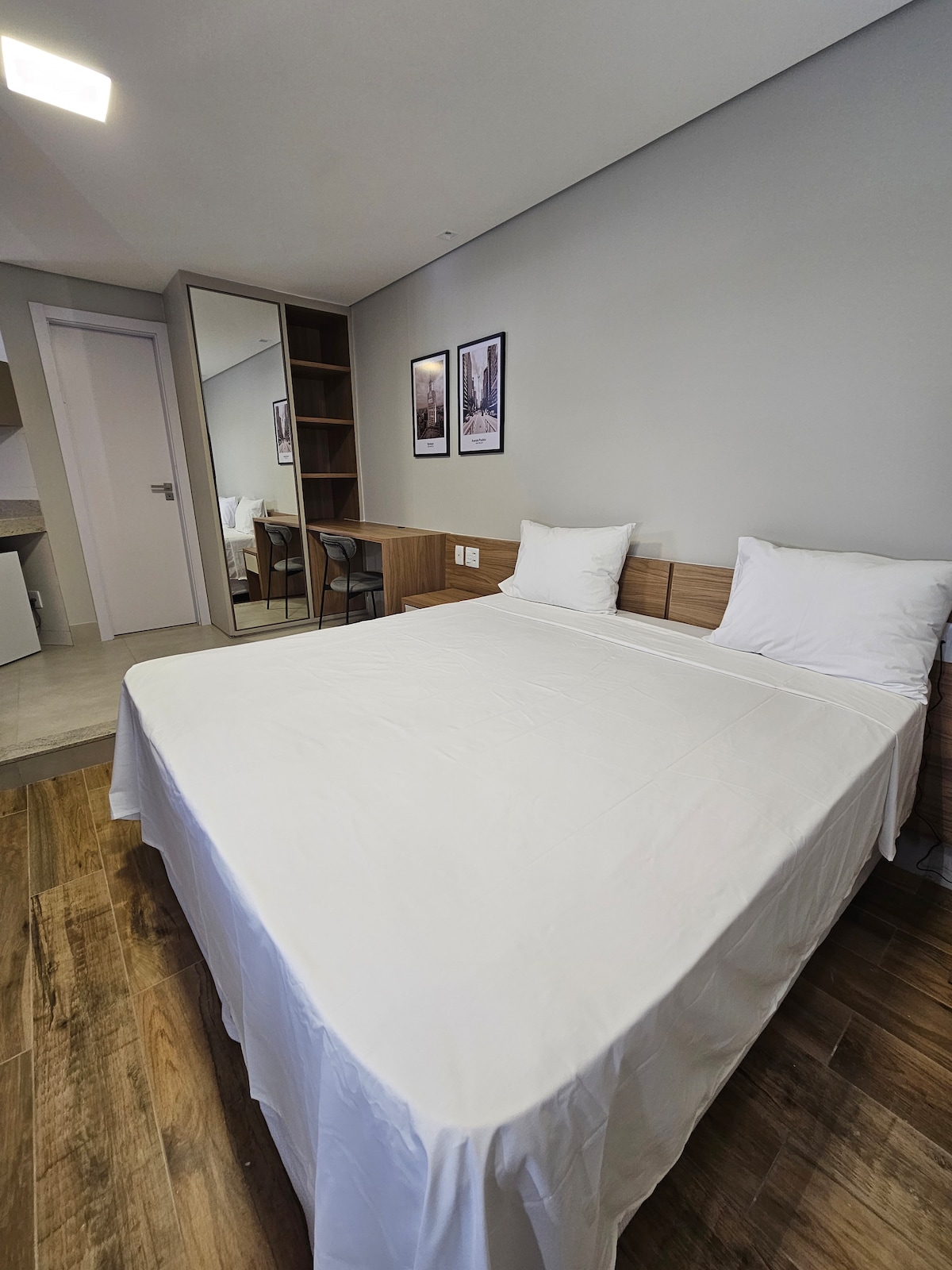 Desfrute de uma estadia tranquila e aconchegante em nosso quarto cuidadosamente preparado para oferecer conforto - QUARTO: Cama de casal Ar-condicionado TV Wi-Fi Frigobar Banheiro Cadeira / balcão Cafeteira Guarda- Roupas Roupas de cama e toalhas inclusas Localização: Estamos localizados no coração da cidade, próximos a restaurantes e lojas.
