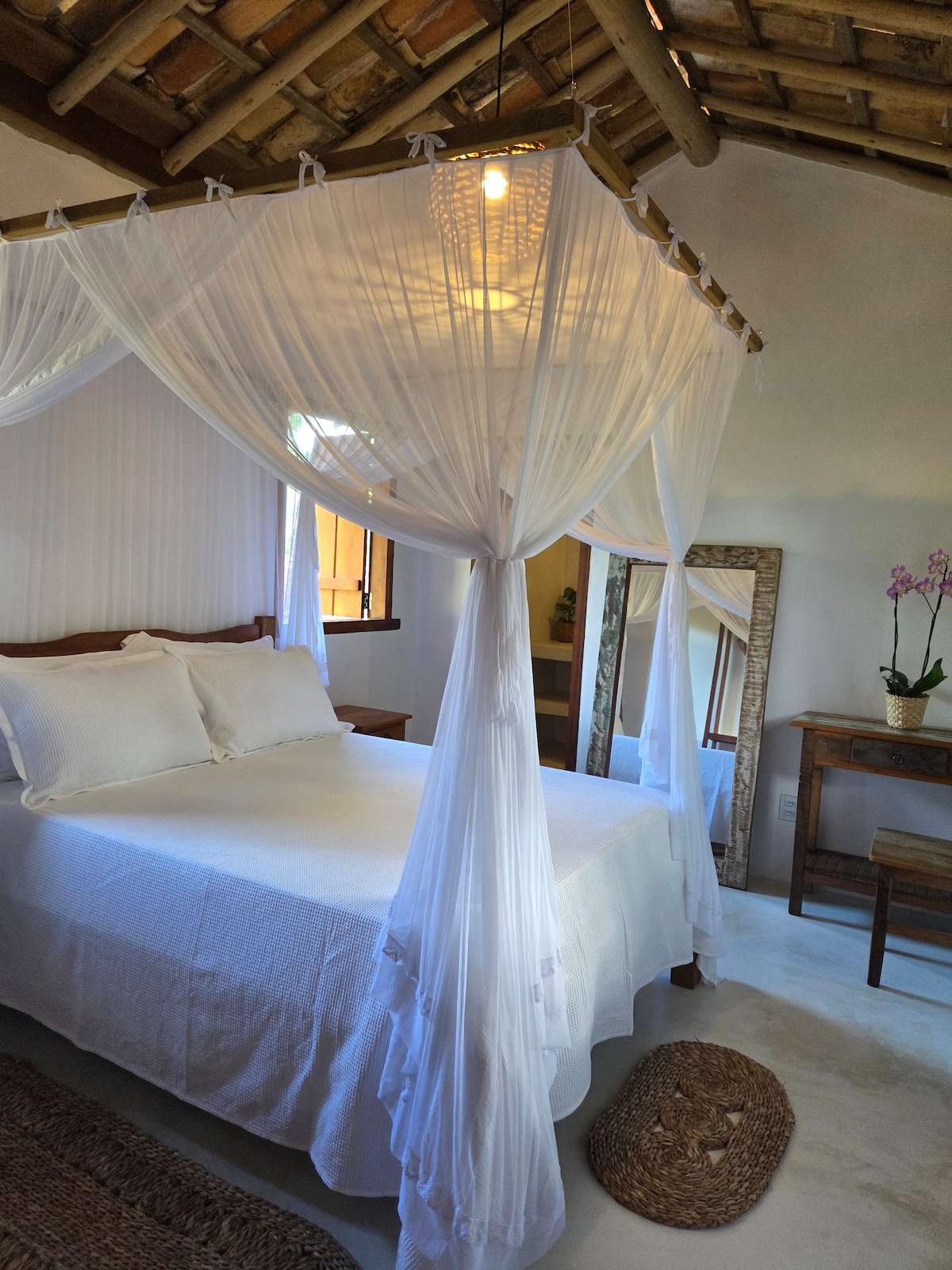 Suíte iluminada no segundo andar de casa MAMAZOO na praia de Caraíva com entrada, varanda e deck de madeira privativa com vista panorâmica para o ceu e o mar. A suíte faz parte da casa principal, atrás dos dois bangalôs. Tem cama queen, banheiro privativo, ar condicionado, frigobar, cafeteira electrica, pratos e talheres e copos. Um espaco ideal para descansar ou trabalhar.