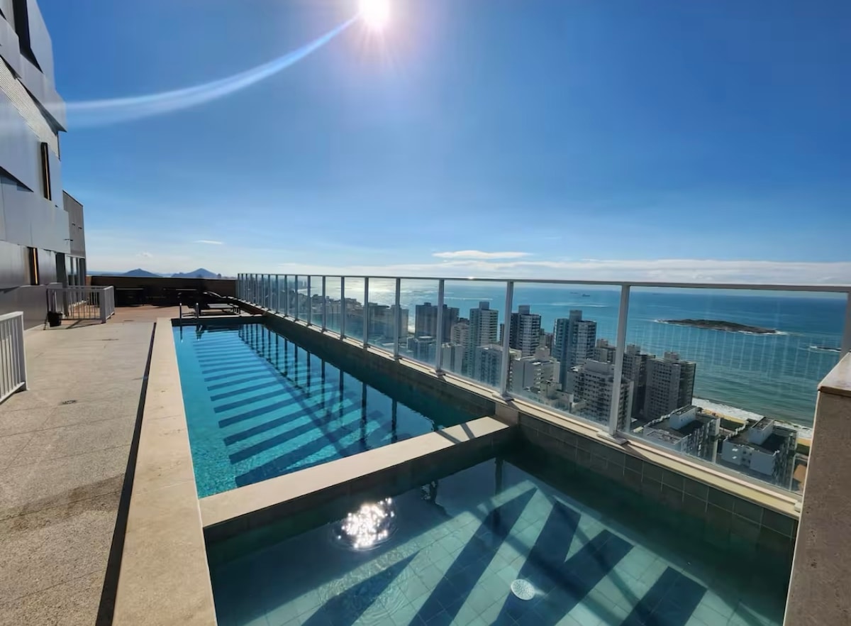 Cobertura com Jacuzzi e vista para o mar com teto solar. Muito espaçosa (65 m2). Melhor ponto da Praia da Costa, a melhor praia de Vila Velha! Cozinha totalmente equipada com utensílios diversos para bar, coqueleteria e taças finas. Suíte climatizada, confortável e aconchegante. Simplesmente a melhor experiência de hospedagem de Vila Velha! Sua estadia por aqui será perfeita! SÓ VEM !!!
