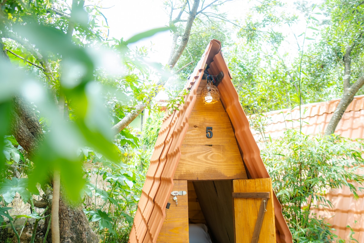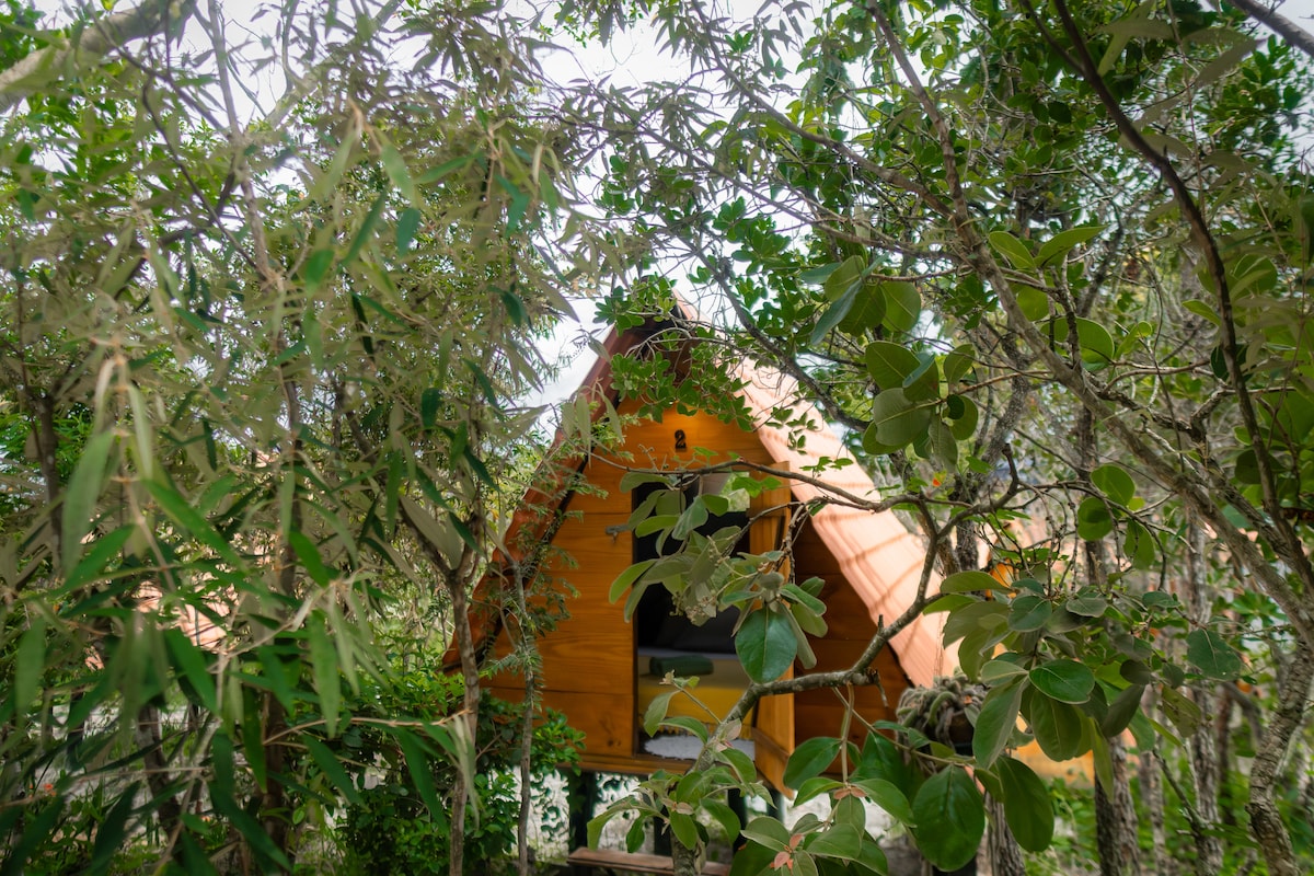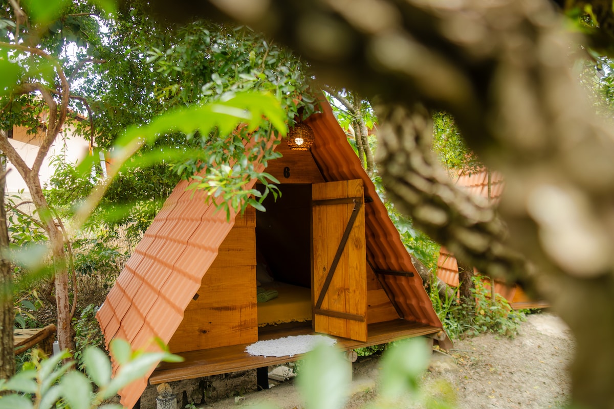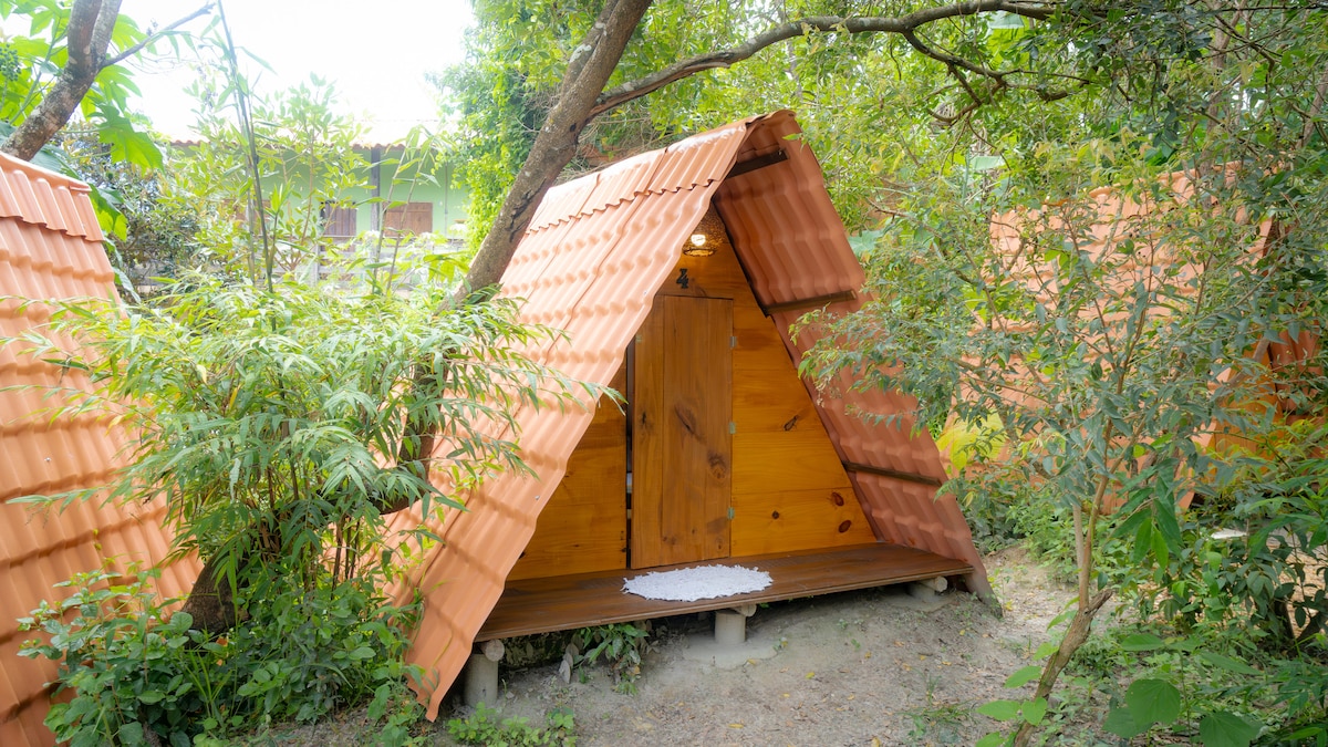 Essa cabana super fresquinha , tem 1 colchão de casal, 1 ventilador,roupas de cama , travesseiros .A tenda fica entre árvores, temos banheiros coletivos na área térrea, super limpos com banho quente e frio, ,redes, Wifi e muitos pássaros. Perfeita para pessoas que curtem a natureza e uma forma diferente de se hospedar. Ficamos próximos da praia da cueira uma das praia mais lindas do Brasil.Boipeba uma ilha encantadora e aqui no nosso espaço preservamos a natureza e a tranqüilidade.