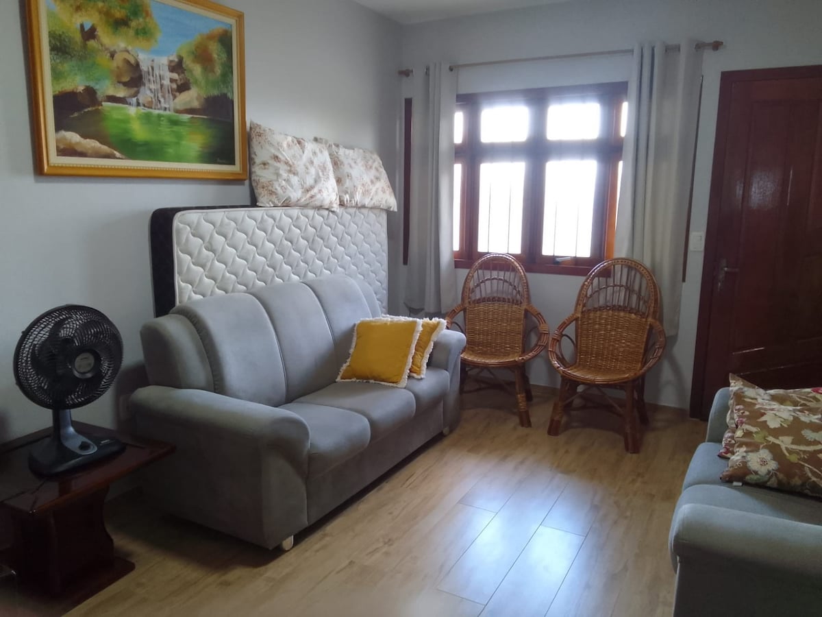 sala, cozinha, banheiro, 1 quarto ar condicionado 2 camas casal, 1 quarto ar condicionado 1 cama casal e 1 cama solteiro e um sofá cama casa garagem coberta e pátio fechado. O valor é por pessoa, tanto que o aplicativo deve ser colocado a quantidade de pessoas na casa.