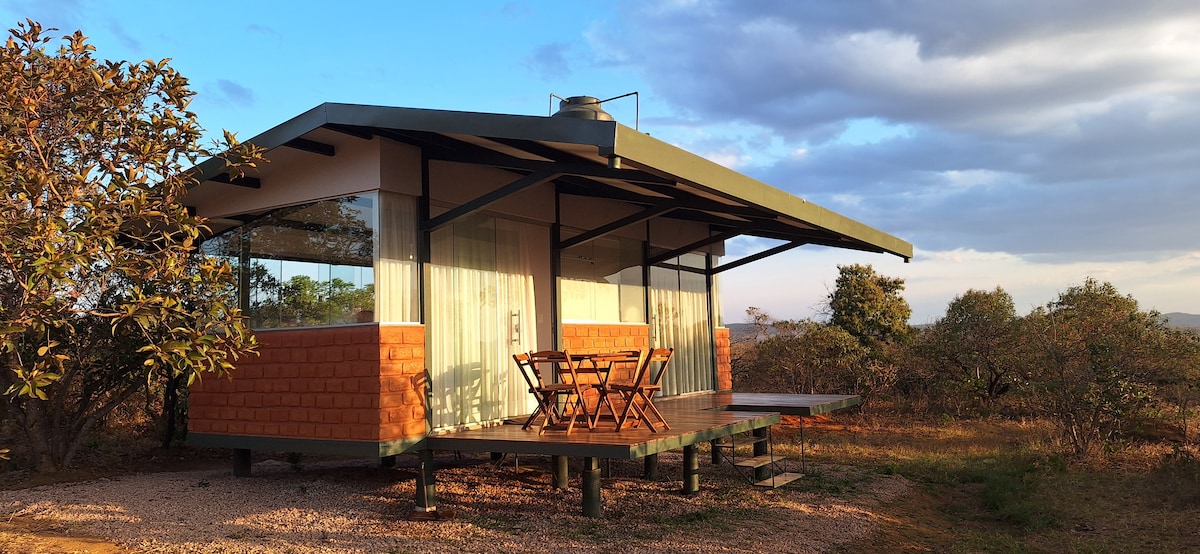 Cabana exclusiva na Chapada dos Veadeiros, perfeita para quem busca descanso e conforto em meio a 1.000m² de cerrado preservado. Com um design minimalista que se integra à natureza, oferece uma vista espetacular do nascer do sol, ideal para casais. Aproveite a rede suspensa para admirar as montanhas e as estrelas, além da banheira de imersão com aquecimento a gás, sais de banho e jardim de inverno, proporcionando uma experiência relaxante e inesquecível em um cenário de pura beleza natural.