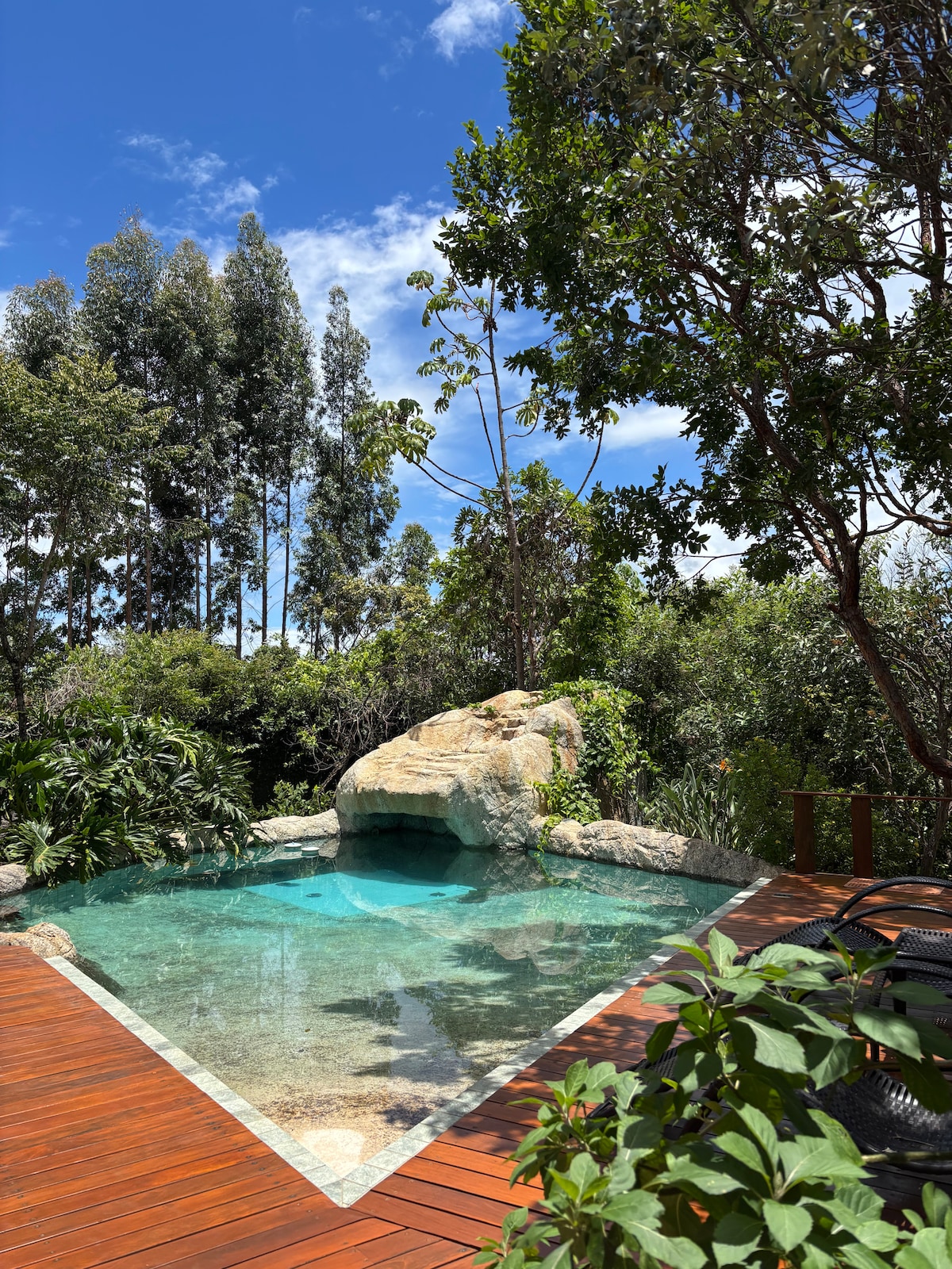 Com uma maravilhosa vista do vale e das montanhas e uma area para contemplação com banheira de hidromassagem privativa e piscina compartilhada, a Cabana Pouso Alto foi inspirada na arquitetura típica da região da Chapada dos Veadeiros. Construída com paredes de tijolos ecológicos de adobe, estrutura de eucalipto de reflorestamento e piso de cimento queimado, ela proporciona a seus visitantes a verdadeira experiência de viver e sentir a vida como ela é em meio ao cerrado. Piscina compartilhada