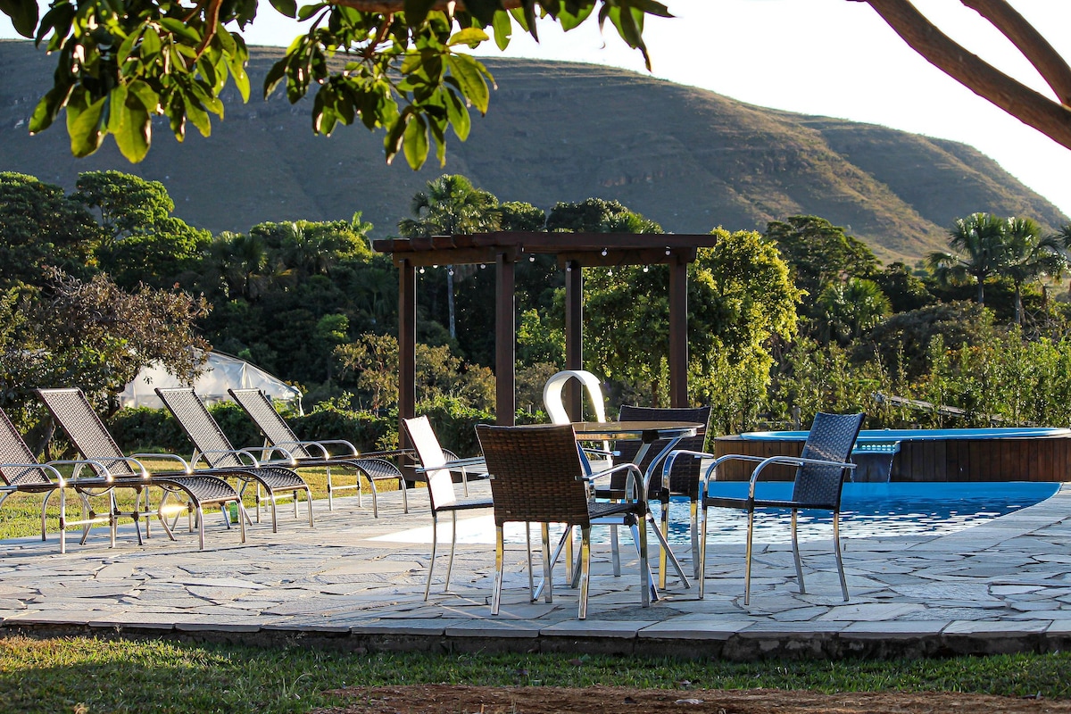 Escape the routine and connect with nature at our home, just 12 km from Alto Paraíso, in the peaceful Povoado do Moinho. Experience unique moments in a reserved environment perfect for relaxing and recharging your energy, feeling at home. Enjoy baths in the river, starry nights, have a barbecue with friends, savor a good book in the hammock, or simply relax listening to the birds singing. Nature invites you! Book now and live this unique experience