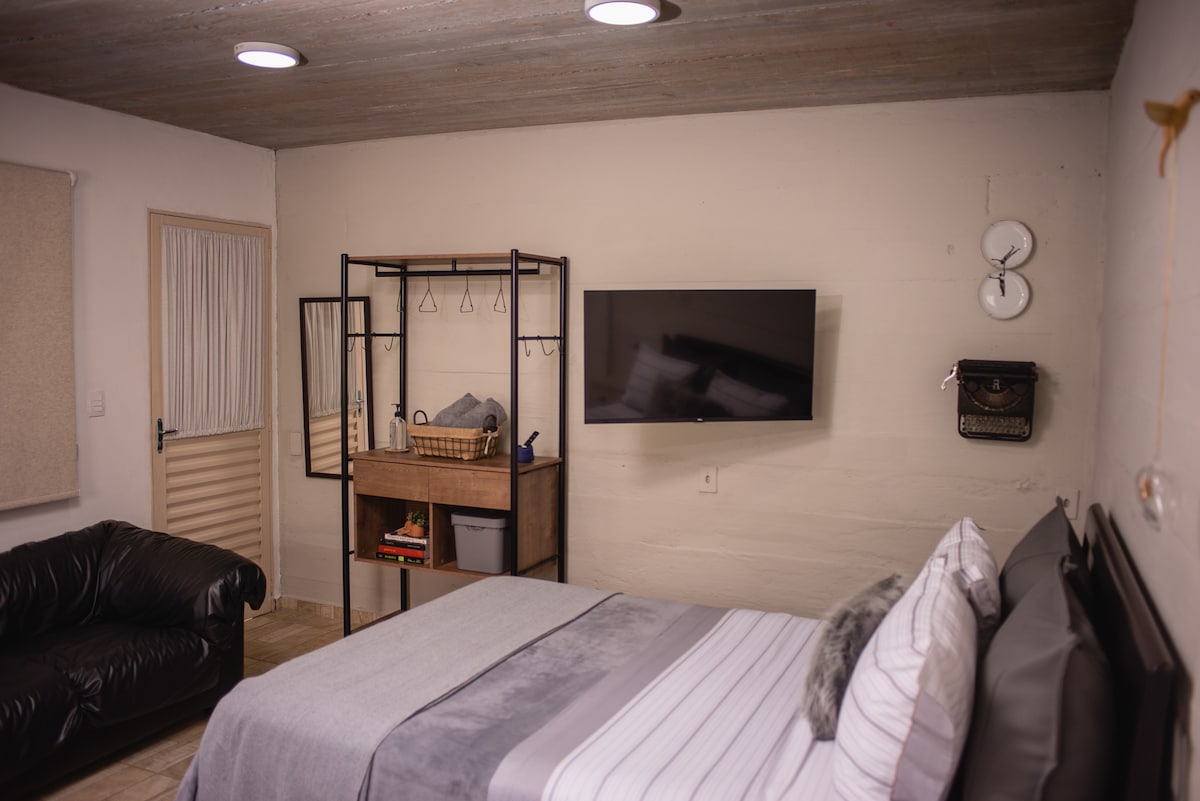 Um loft, com entrada independente, banheiro exclusivo, colchão ortopédico, frigobar, sanduicheira, mixer, cafeteira, ventilador de teto, cozinha, lavanderia e jardim acolhedor, "perto suficiente do centro mas ao mesmo tempo longe suficiente para dormir com sossego". Anexo a uma casa antiga e agradável no Bairro Segredo junto ao Centro Histórico de S. João del Rei, com garagem coberta. Não aceitamos pets.