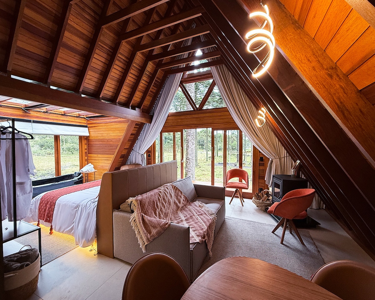 Linda cabana A-frame com localização privilegiada, próxima as principais vinícolas da região. Super aconchegante, com uma vista incrível do vale e das araucárias. Venha curtir esse sossego, ao som dos pássaros e com toda a tranquilidade que o lugar oferece. A cabana conta com banheira de hidromassagem, e área externa com praça de fogo e um mirante para você ficar conectado com a natureza. Venha desfrutar dessa experiência única na cidade da Neve! A Winter Valley Cabins espera por você.