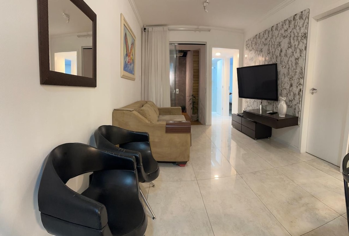 Studio de 49m2, sem divisórias, com sacada, wi-fi, SmartTV, sofá retrátil, cozinha com cookietop, forno, micro-ondas, filtro, geladeira, jogo de panelas, talheres, cafeteira, liquidificador, sanduicheira, copos/taças, tábua de passar e varal de chão. Cama queen, lençóis, toalhas, ar ❄️ e 🔥, armário p/ 2 e cortinas blecaute. Tem ferro de passar e secador. Home office. Piscina/garagem/academia/lavanderia. A 2 quadras de supermercados, cafés, farmácias, bares, restaurantes e academias.
