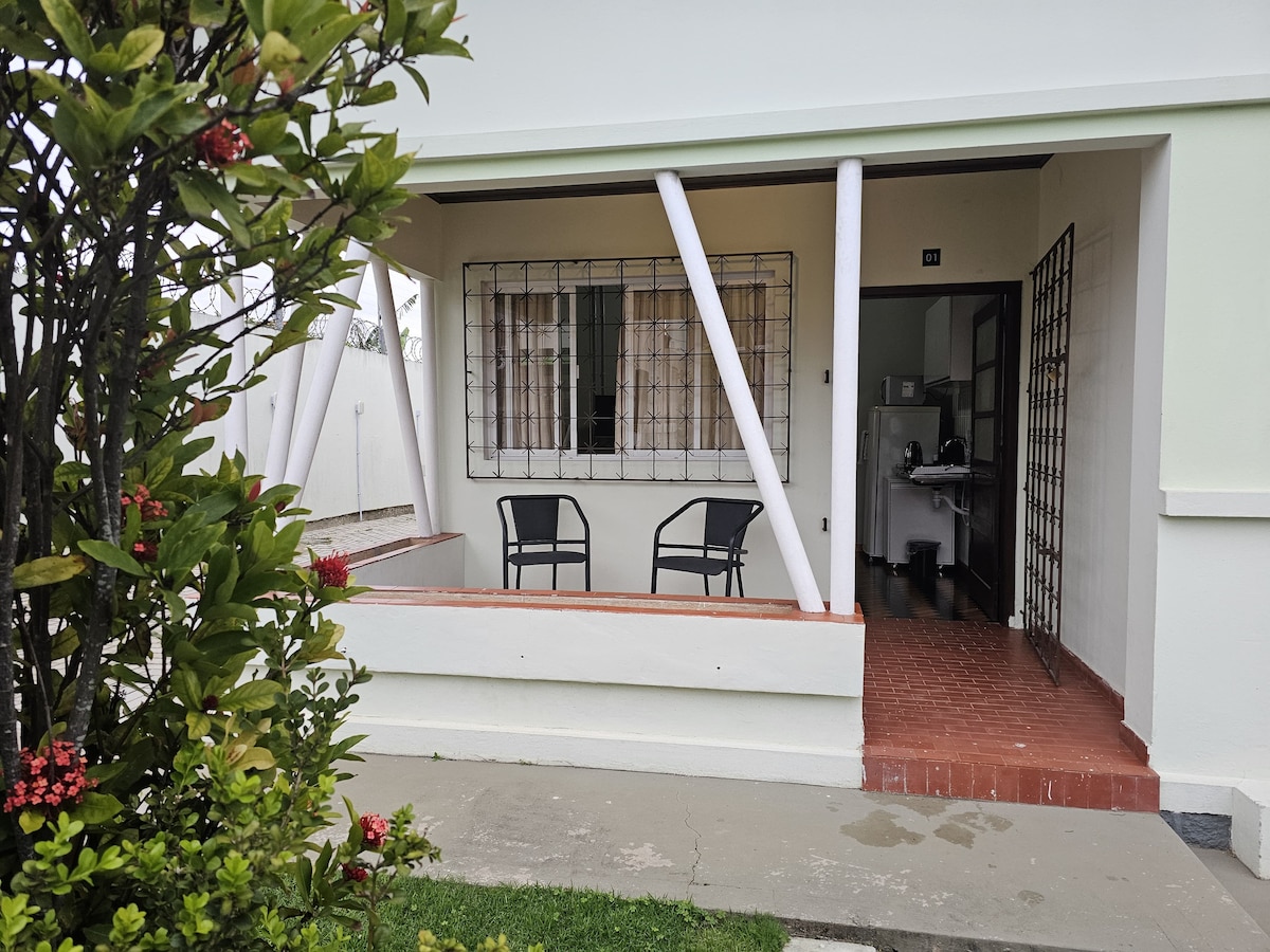 APARTAMENTO TÉRREO Área externa privativa Condomínio com PISCINA. Quarto 1 com cama casal, ar condicionado, mesa para home office; Quarto 2 com cama de casal, ventilador de teto, mesa para home office; 1 banheiro; 1 vaga garagem; 1 cozinha completa (liquidificador, fogão, pia, geladeira, torradeira, ferro de passar, varal, máquina lavar roupas). Apartamento com área aberta privativa. Smart Tv com Prime Vídeo e demais apps. O condomínio não permite visitas aos hóspedes. Portaria 24hs.