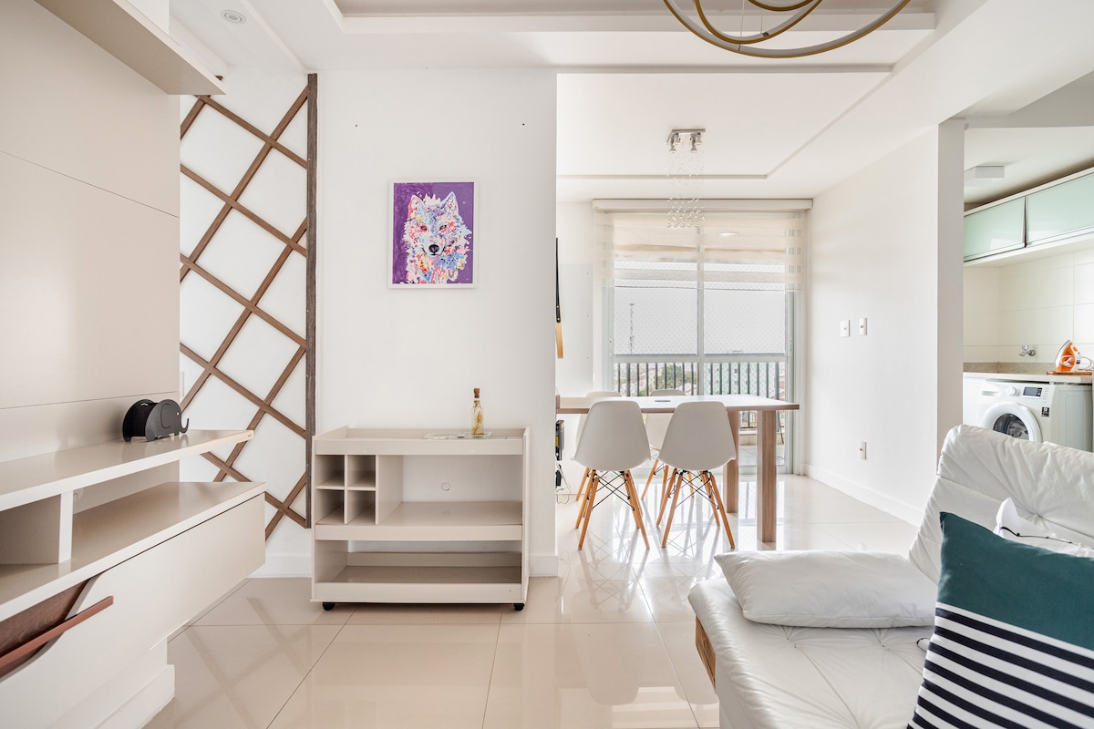 Apto.amplo,10minFlorianópolis,luminoso,sacada,vista ao mar, cozinha p/preparar refeição rápida,fogão indução,micro-ondas, ai fryer, cafeteira e chaleira elétrica, geladeira, lavarroupa, chuveiro quente/frio, quarto suite c/banheiro, ar condicionado quente/frio, cama Queen,sala com sofa cama, localizado bairro Kobrasol,seguro p/ passear a noite, próximo gastronomia e Boulevard Parque Beira Mar,São José,SC. O apto atende turistas, executivos,viajantes, free-lancer, lembra como se fosse sua casa !