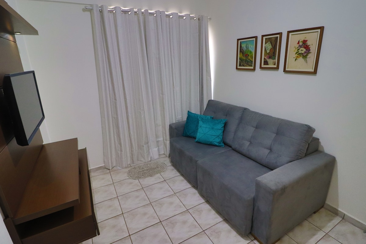 Espaco ideal para curtas estadias. Sala de dois ambientes com ventilador: mesa com cadeiras e TV. Sacada com linda vista! Quarto com ar condicionado: uma cama solteiro e uma cama casal (possibilidade de colchão extra no chão). Banheiro com box e gabinete. Garagem para moto. Fechadura eletrônica. Prédio tranquilo e familiar. Muito seguro!