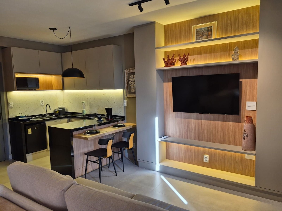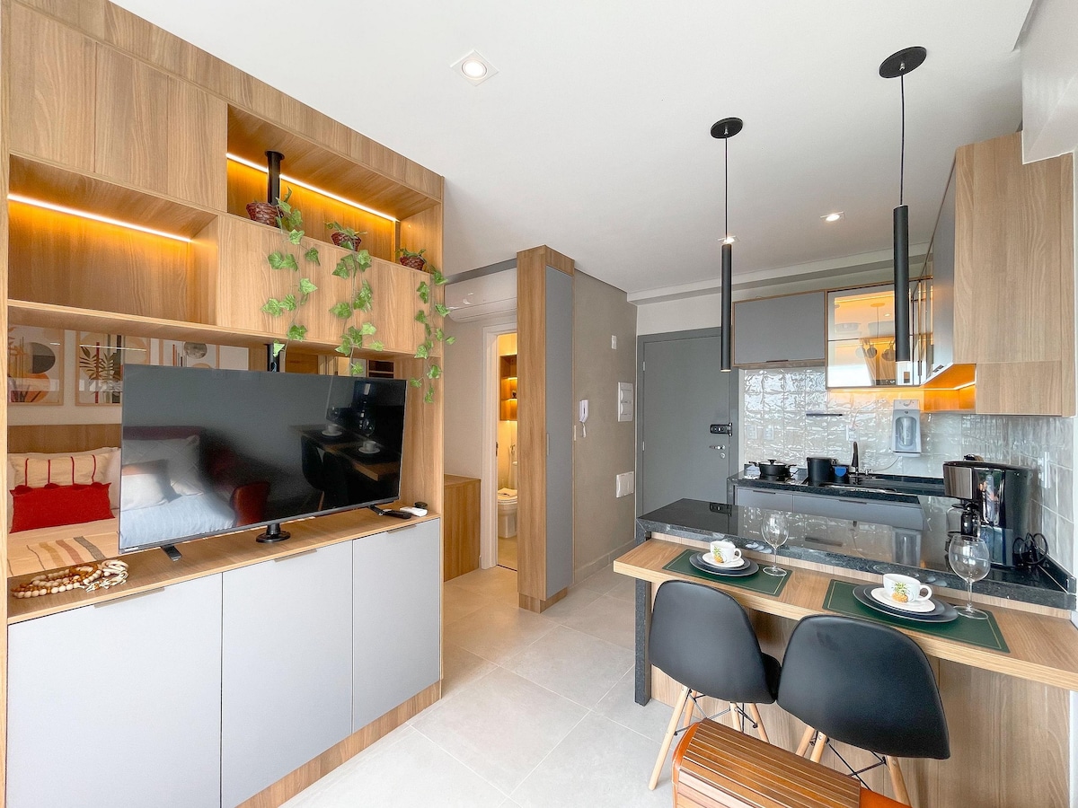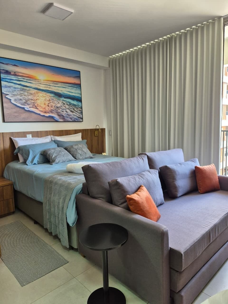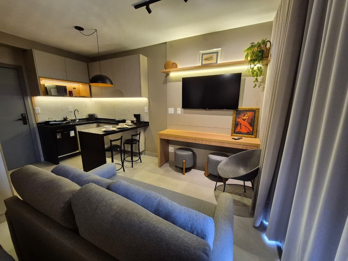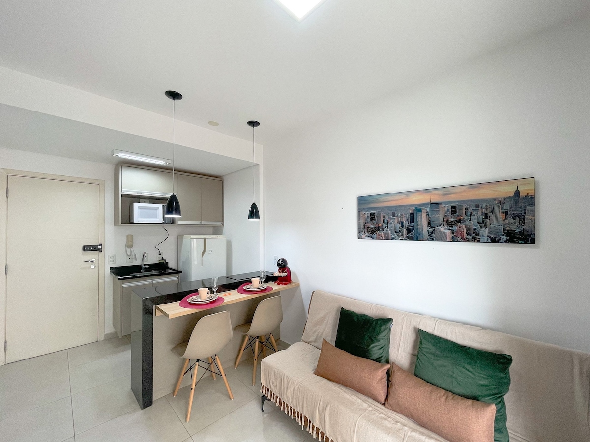 Apartamento tipo Loft, com cozinha completa, ar condicionado, utensílios, tv, sofá cama, sacada gourmet. Excelente localização. Condomínio dispõe de um espaço ideal para lazer, com piscina, sauna, sala de jogos, winebar.