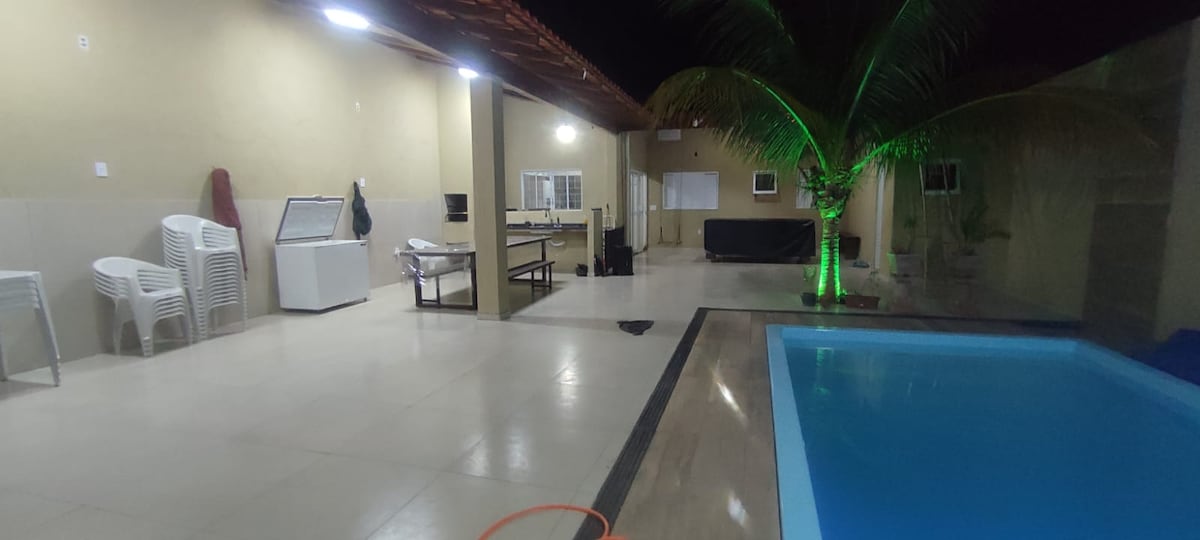 Sua família vai estar perto de tudo ao ficar neste lugar bem-localizado. Próxima ao recinto de exposições ,centro, aeroporto, padaria e mercado. Churrasqueira , 3 quartos, 4 banheiros (2 com chuveiros), salas amplas, sem degraus, vaga para 3 veículos. Ar condicionado em 2 dos quartos e ventiladores nos quartos, sala e churrasqueira. 1 sala tem 1 cama de casal e 1 de solteiro sem ventilador. Brinquedos para distração das crianças Utensílios domésticos, lençóis, travesseiros e mantas.