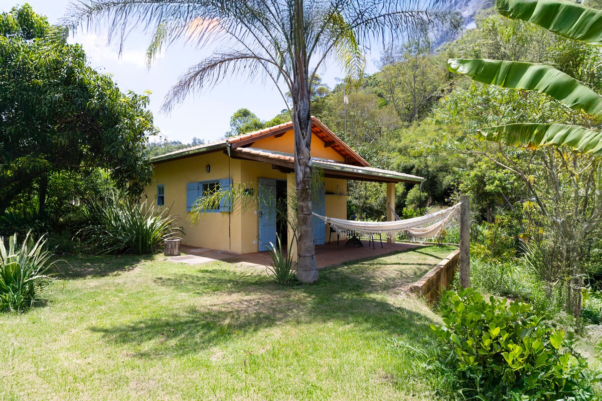 Sítio imerso na natureza, em local isolado e silencioso, com vista deslumbrante. Casa charmosa e arejada. Um quarto com banheiro, cozinha completa, Wi-Fi, varanda, churrasqueira e redário. Colchões e enxovais de ótima qualidade • trilha na mata, dentro da propriedade, de fácil acesso • Áreas externas compartilhadas entre 3 casas (piscina, sauna, academia, fogueira) • Cidade/restaurantes a ~25 min • Caseira pode cozinhar (combinar direto)