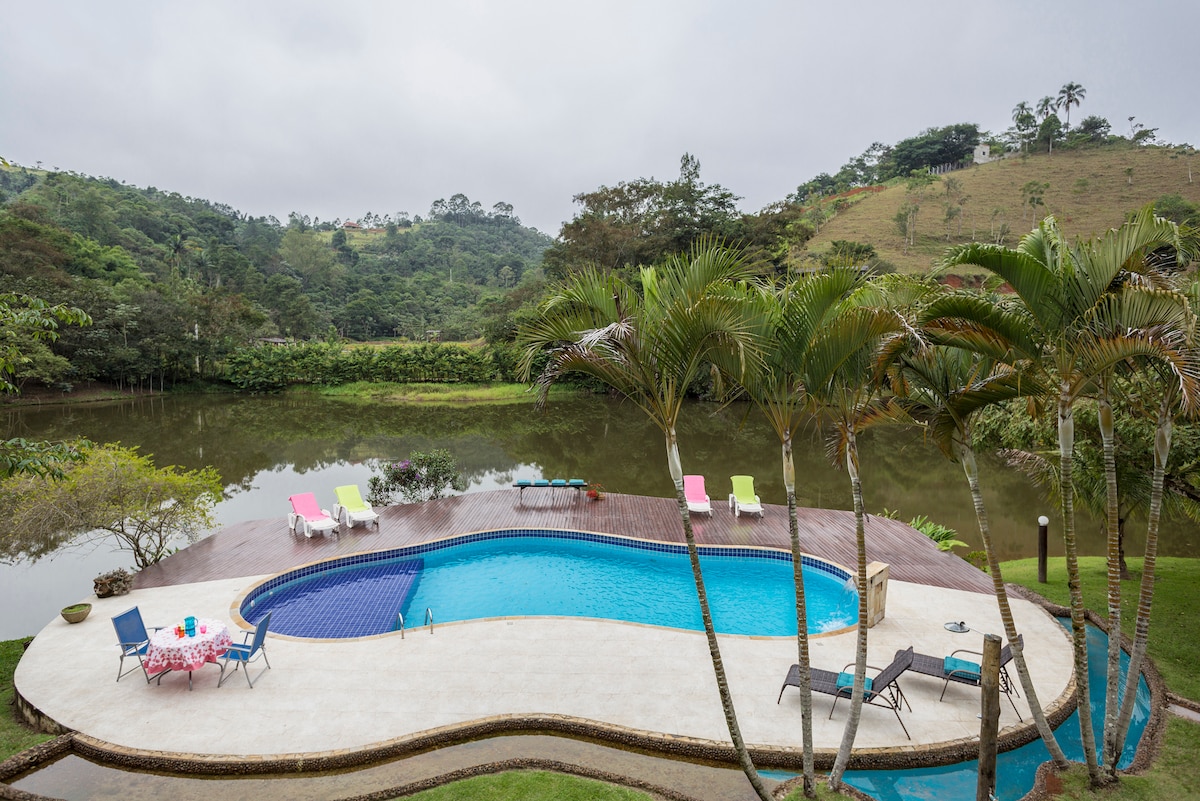 Hospede-se dentro de um Haras, no verdadeiro paraíso em meio a natureza, rodeado pelo exuberante Rio Paraíba do Sul com uma paisagem incrível. Fácil acesso, 1.5km de estrada de terra (plana e cascalhada). Mercados, padarias e farmácia próximos Casa nova, totalmente plana e completa! Ar condicionado em todos os quartos! A piscina é incrível! Churrasqueira, fogão e forno a lenha na varanda. Mesa de ping-pong, sinuca, balanço e escorregador. Opção de adquirir passeio à cavalo e pesca esportiva.
