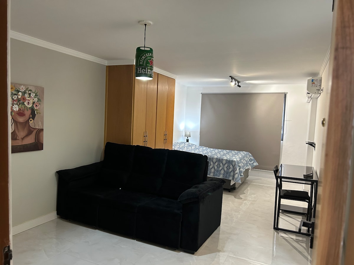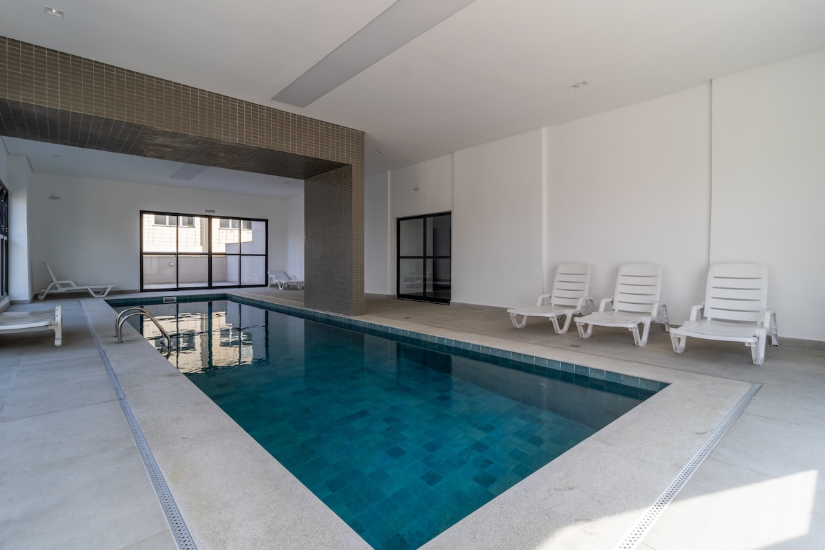 Este espaço foi pensado em cada detalhe para tornar sua estadia em algo especial. Apartamento completo, banheiro espaçoso, uma confortável cama Queen e um sofá cama para 2 pessoas. O condomínio possui recepção bilíngue 24 horas, piscina com cascata, sauna , academia e restaurante, com café da manhã colonial, almoço e happy hour (serviços opcionais pago no local). Proximidades: Praça Ulisses Guimarães, supermercado, academia, shopping e rodovias Dutra e Carvalho Pinto.