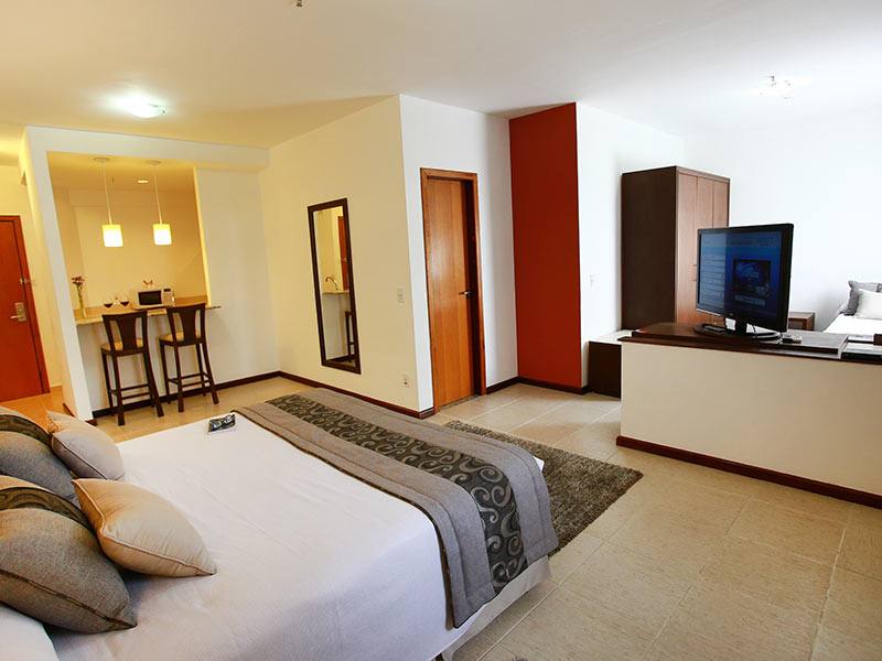 47 m² com mini cozinha e sala de tv • Estação de trabalho • Wi-fi • Cama King-size • Secador . Frigobar, microondas, tanque . Serviço de lavanderia terceirizado • Cofre • TV LCD a cabo com canais de filmes, esportes e notícias • Trava na porta dos quartos e cartão chave • Ar condicionado Split . 01 vaga de estacionamento . Restaurante no edifício (valores a parte) . Piscina/ sauna e pequena academia de ginástica . Recepção bilíngue 24h
