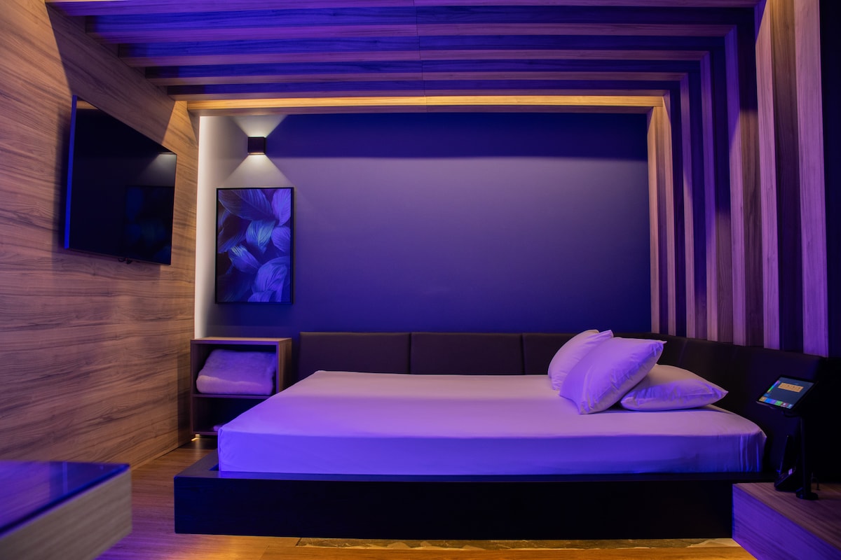 Hospede-se com praticidade, conforto e total privacidade em nossa Suíte Gran Luxo. *Café da Manhã Incluso - Servido das 7:15 às 10:30 *Suíte Disponível nas Cores: Amarela, Azul ou Vermelha - Sujeito à Disponibilidade - Jacuzzi com Cromoterapia - Tablet para Controle de Luzes, Som e Pedidos - Ar-Condicionado Split - TV Smart - Frigobar - Wi-Fi - Cozinha 24 Horas - Secador de Cabelo - Amenities de Banho - Garagem Privativa