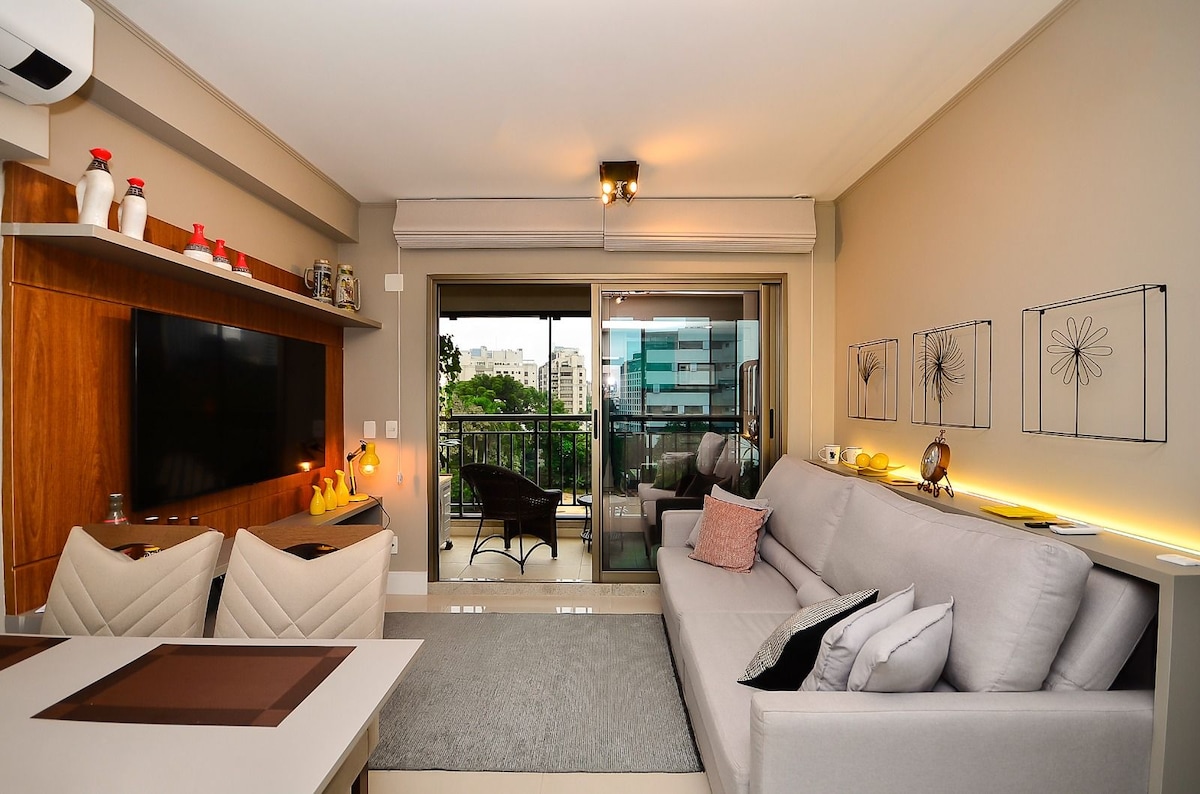 9º andar - 43m - Bairro Nobre - Varanda Gourmet c/ churrasqueira - Sofá-cama NOVO e super confortável - Cozinha completa - Ar condicionado quente e frio - SmarTv - Uma Vaga de garagem - Cozinha completa - Wi-fi de qualidade - Filtro purificador de água OBS.: Não administramos as áreas sociais do condomínio. O funcionamento dessas áreas pode ser interrompidos para manutenção, sem aviso prévio. Caso ocorra, não haverá reembolso de valores.