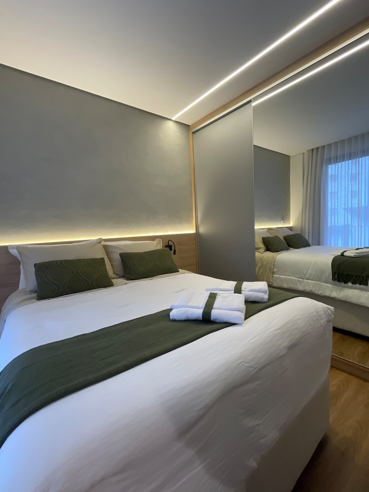 Apartamento com garagem e ar-condicionado, com vista incrível do 21º andar, Studio em condomínio clube de alto padrão. Áreas comuns com piscina aquecida, academia, coworking, sauna, lavanderia, playground e mercado autônomo. Acomoda 4 pessoas (1 cama casal e 1 sofá-cama), equipado com enxoval completo, ducha relaxante, cozinha planejada com diversos eletrodomésticos e utensílios, e TV Smart moderna que garante o entretenimento.