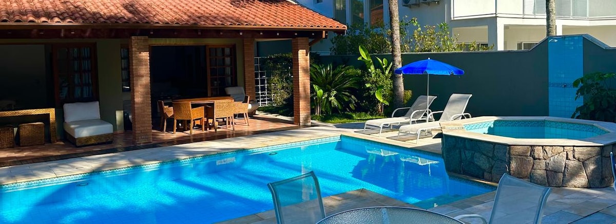 Casa perfeita para um bate e volta de São Paulo! Ambiente familiar e confortável . No Módulo 21 da Riviera de São Lourenço, a 450m da praia, esta casa acomoda até 16 pessoas com conforto. São 5 suítes com ar-condicionado, sala de estar com lareira, sala de jantar integrada à cozinha equipada. A área externa conta com piscina, jardim e espaço gourmet com churrasqueira, ideal para reunir família e amigos. Wi-Fi de qualidade e Smart TV com canais pagos. Aceita PET de pequeno porte.