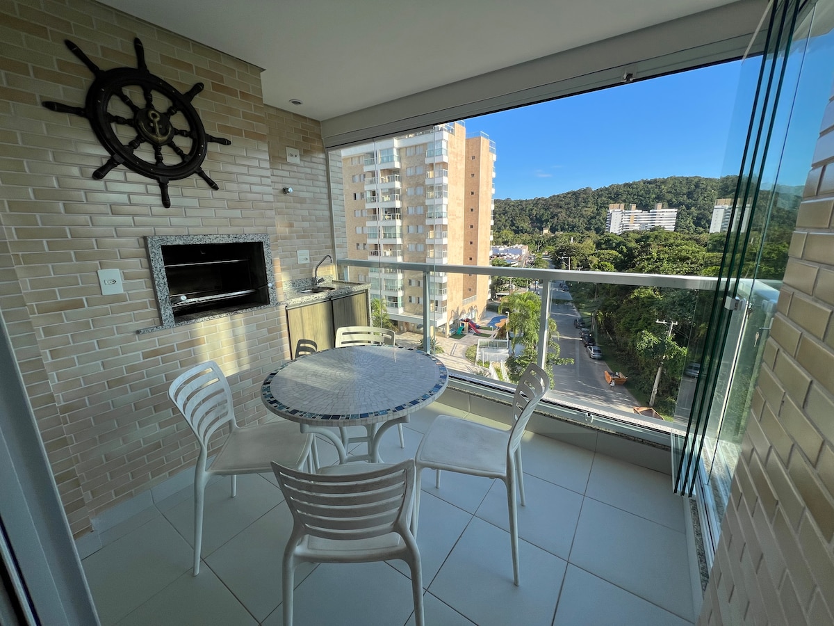 Sejam bem-vindos! Apartamento novo em prédio com lazer completo (piscina, academia, cinema, brinquedoteca, sala de jogos e sauna). Vista panorâmica da Praia do Indaiá. Acomoda até 6 pessoas. Sala ampla e varanda gourmet com churrasqueira rede de descanso. Instalamos rede de proteção para maior segurança das famílias que hospedamos. Apartamento ideal para descansar com vista para o Cantão do Indaiá. O apartamento possui lavanderia com máquina de lavar e dispensa para a guarda de mantimentos.