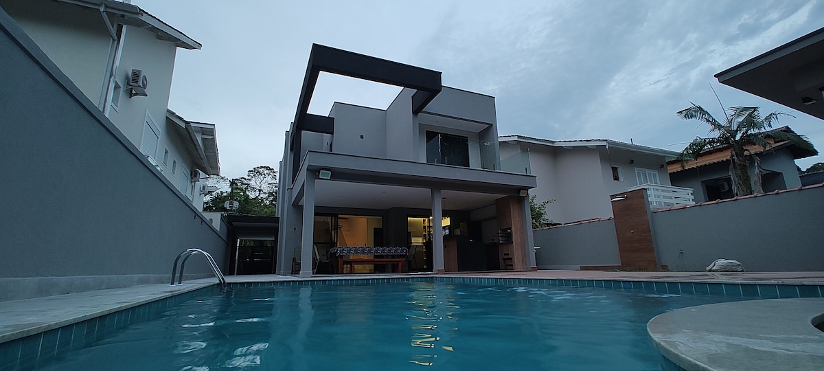 Casa ampla de 6 suítes com ar condicionado Acomoda até 16 hóspedes incluindo as crianças Sala com 3 ambientes e paredes de vidro que permitem contemplar o jardim, TV 55 polegadas, wi-fi, mesa de jogos , 3 sofás, bar, sala de jantar com 10 cadeiras Área de lazer com mesa de pebolim, churrasqueira, chaise, piscina climatizada, espreguiçadeiras. Temos uma caseira que cozinha bem e poderá ser contratada para trabalhar. Não locamos para festas e grupos de jovens. Aceito até 2 pets pequeno porte
