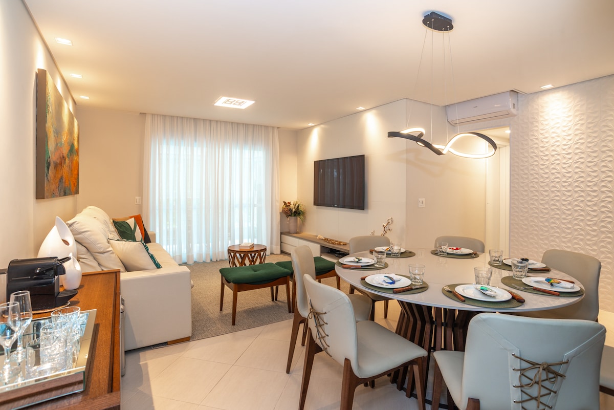 Confortável flat à 150m da praia, em Riviera de São Lourenço. Ar condicionado e Smartv em todos ambientes. Piscina climatizada e sauna na cobertura (área comum), salão de jogos, playground, quadra de tênis e poliesportiva, piscina infantil e adulta. Recepção 24h. Serviço de quarto diário, manutenção emergencial, manobrista, restaurante com opcional de café da manhã, almoço e jantar (pagos à parte). Serviço de praia com 3 cadeiras e guarda-sol. Internet Wi-fi Roupa de cama e banho à parte