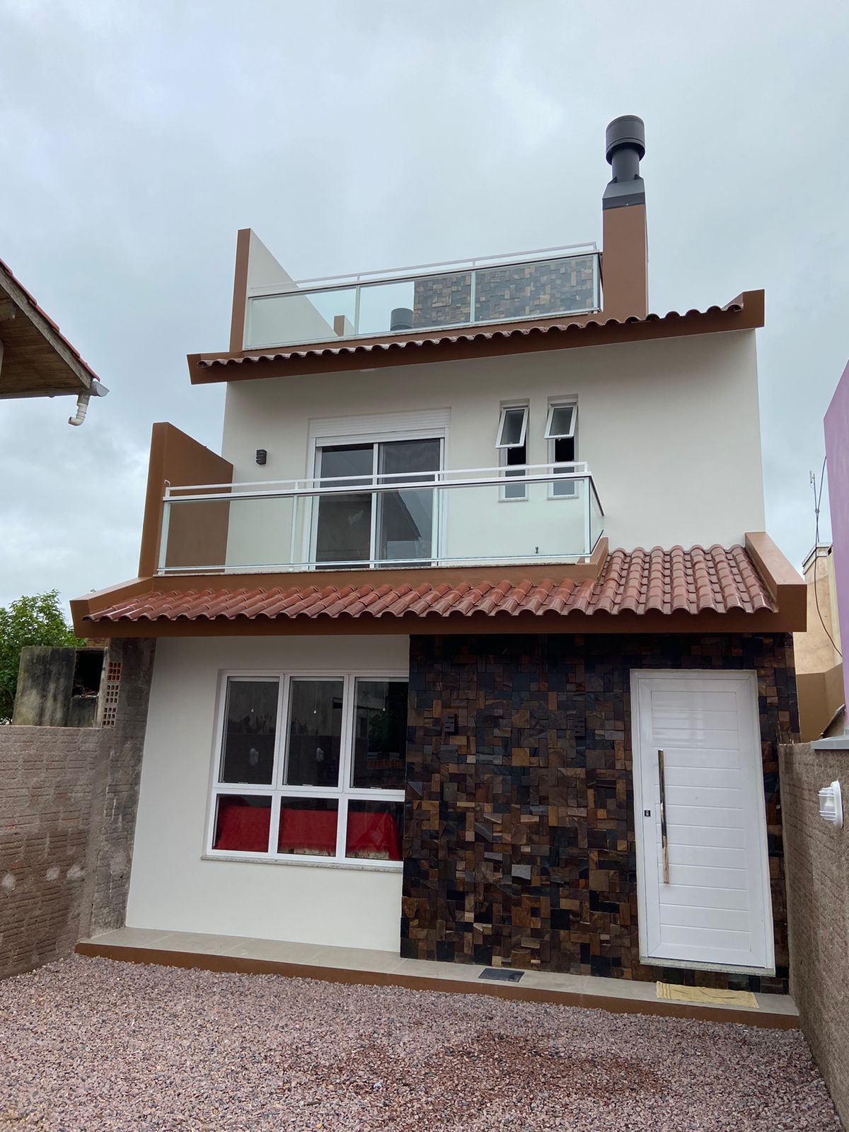 Hospedagem Familiar, Sobrado com cozinha e churrasqueira na parte inferior e quarto com 1 cama de casal e 1 cama de solteiro, banheiro e sacada na parte superior.
