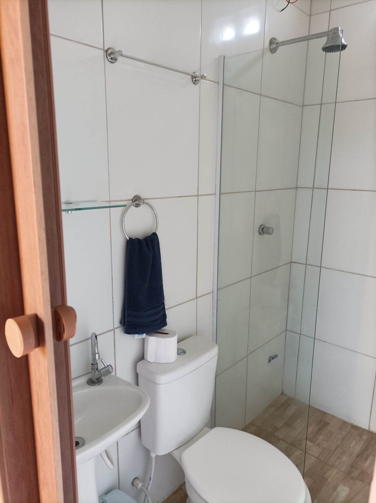 Quarto de 18m2, cama casal, ar condicionado dentro de uma pousada. Banheiro privao no quarto.