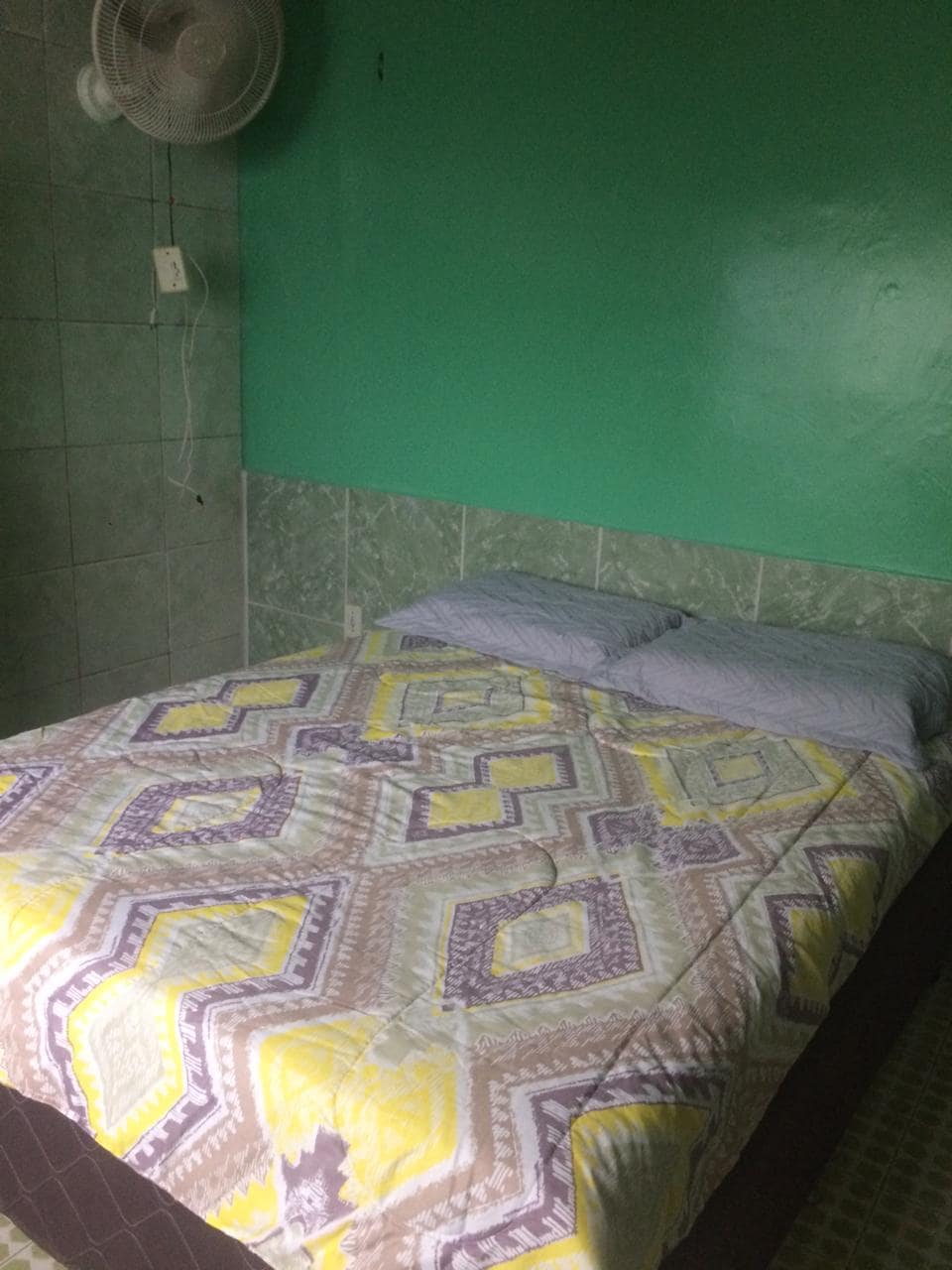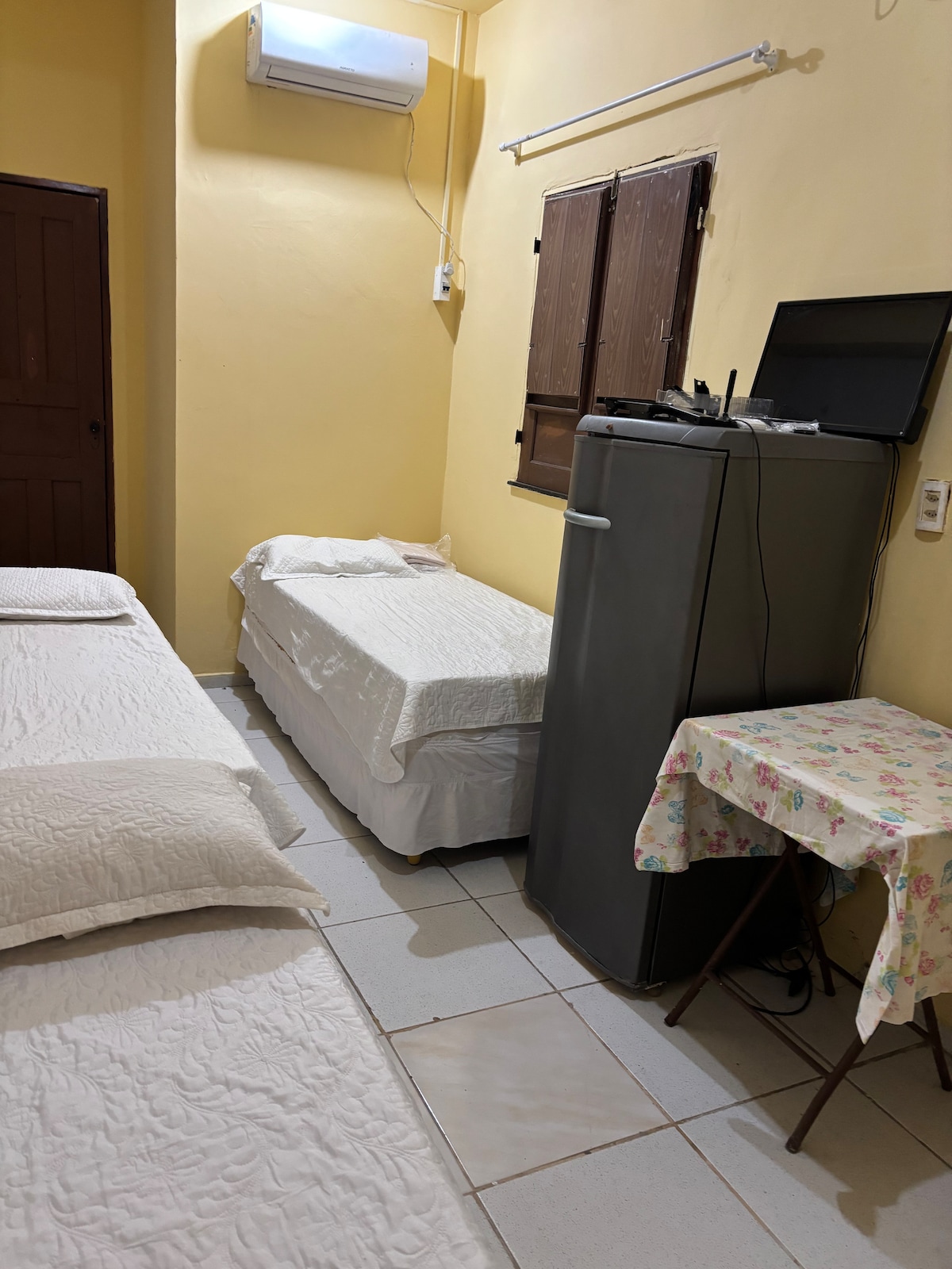 Quarto de 18m2, cama casal, ar condicionado dentro de uma pousada. Banheiro privao no quarto.