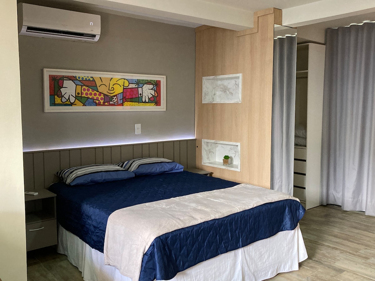 A acomodação está localizada em uma esquina, o que garante boa ventilação natural. Por estar em rua movimentada, podem ocorrer ruídos externos, como trânsito e circulação de pessoas. Não é indicada para hóspedes que buscam silêncio absoluto. O espaço é novo e está em fase final de ajustes, podendo ainda haver pequenos detalhes de acabamento em andamento, como a porta do banheiro, painel, etc. Apesar disso, a suíte já está funcional e disponível para hospedagem, sem interferir no uso do quarto.