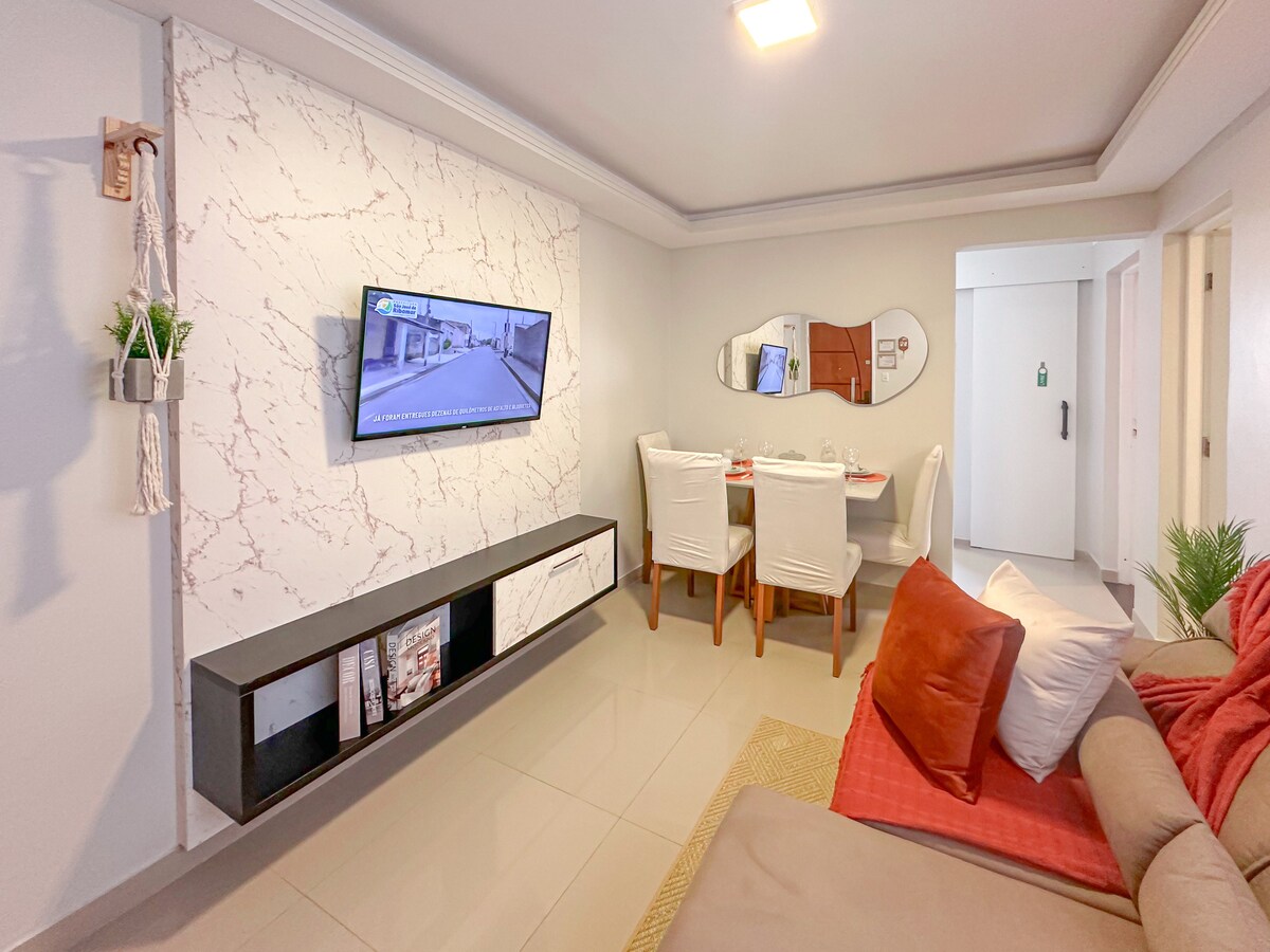 Apartamento 100% nascente, muito ventilado, de 57 m² com 2 quartos, sendo uma suíte, (2 banheiros) totalmente projetados e mobiliados. Com garagem. Localização estratégica: a 10 min da rodoviária, 14 min aeroporto, 5 min do shopping e 15 min das praias. Segurança, comodidade e muita ventilação, além de uma varanda perfeita para relaxar. Possui elevador. Condomínio solicita documento oficial com foto para cadastro de acesso. A recusa no envio impede a entrada e pode cancelar a reserva.