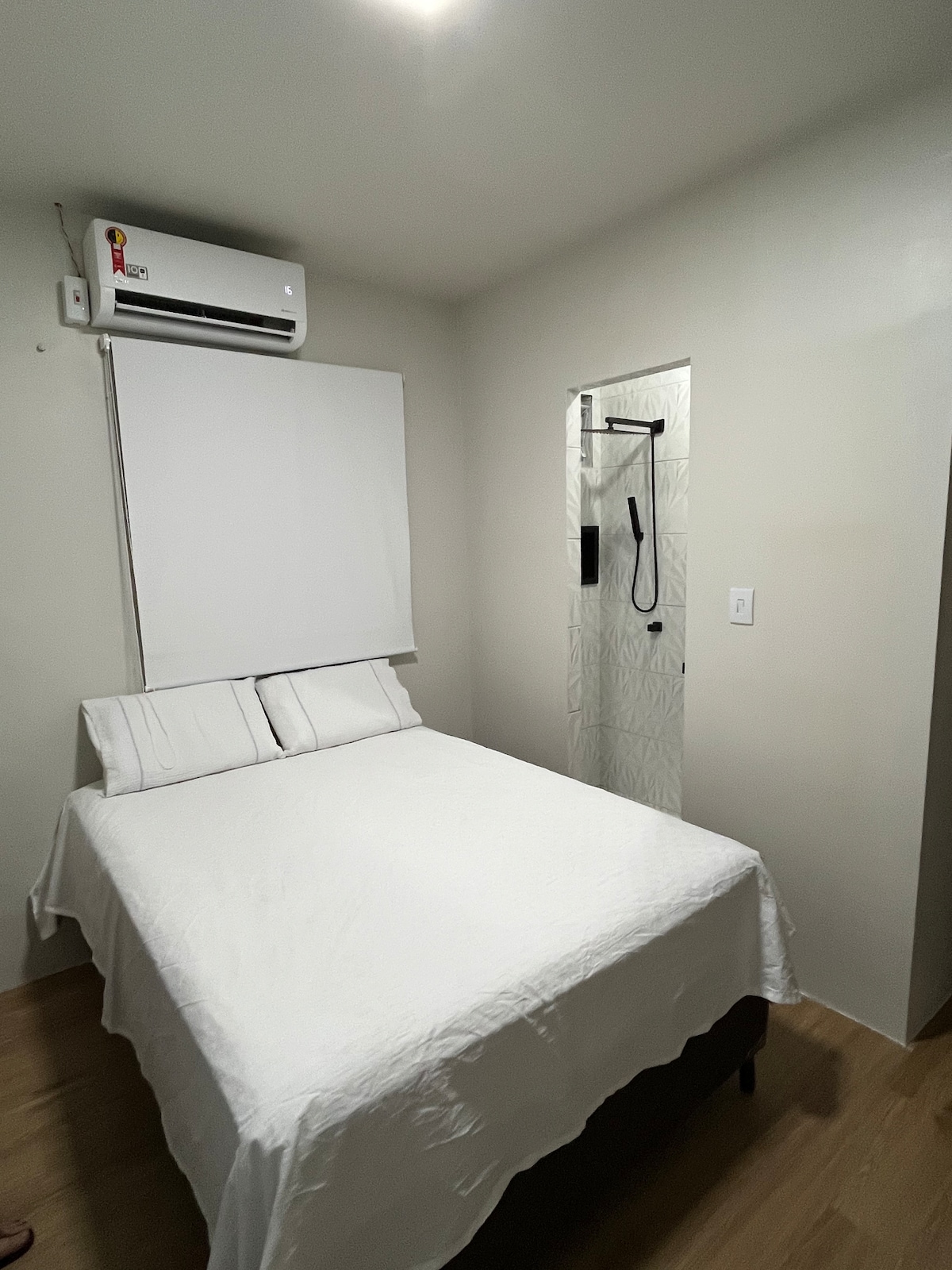 A acomodação está localizada em uma esquina, o que garante boa ventilação natural. Por estar em rua movimentada, podem ocorrer ruídos externos, como trânsito e circulação de pessoas. Não é indicada para hóspedes que buscam silêncio absoluto. O espaço é novo e está em fase final de ajustes, podendo ainda haver pequenos detalhes de acabamento em andamento, como a porta do banheiro, painel, etc. Apesar disso, a suíte já está funcional e disponível para hospedagem, sem interferir no uso do quarto.