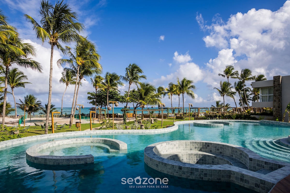 Close to Patacho Beach, our space is designed to offer everything we value in our own travels. With two full suites for up to six adults, a private balcony with barbecue, A/C in every room, a fully equipped kitchen, and a washer-dryer! We guarantee a unique stay! In addition, you’ll have access to a full resort-style condominium with a gym, pool, jacuzzi, playground, and 24-hour reception. The location is excellent, close to restaurants and the natural beauty of Milagres and Japaratinga!
