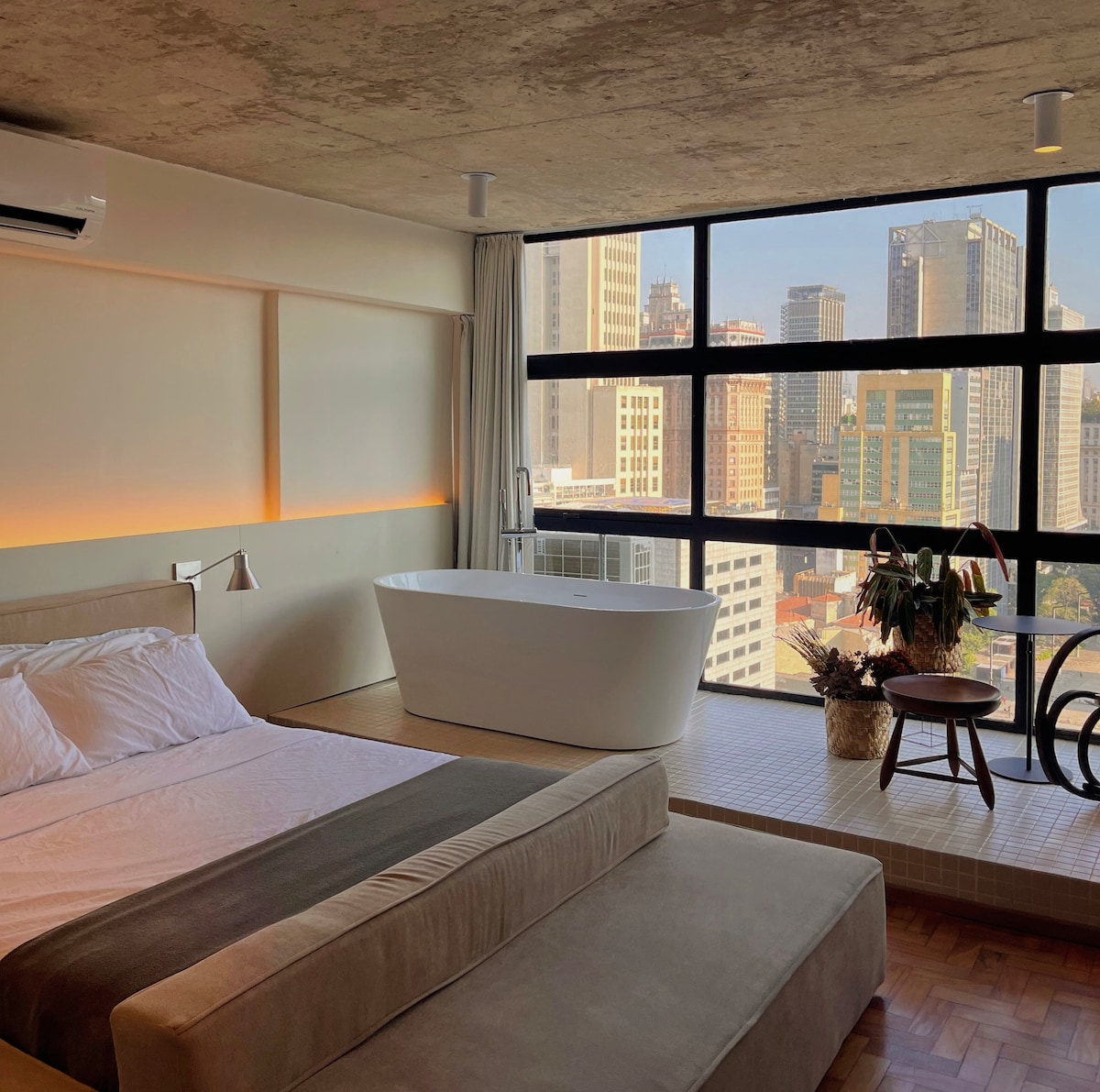Stay on the 30th floor of the Copan Building with one of the most fantastic sunset views. This fully equipped studio has everything you need for an unforgettable stay in Brazil's most famous residential building. Located atop one of architect Oscar Niemeyer's masterpieces, this apartment was completely remodeled in a project by architect Teresa Mascaro, and is now also part of the AirBnB project in Copan.