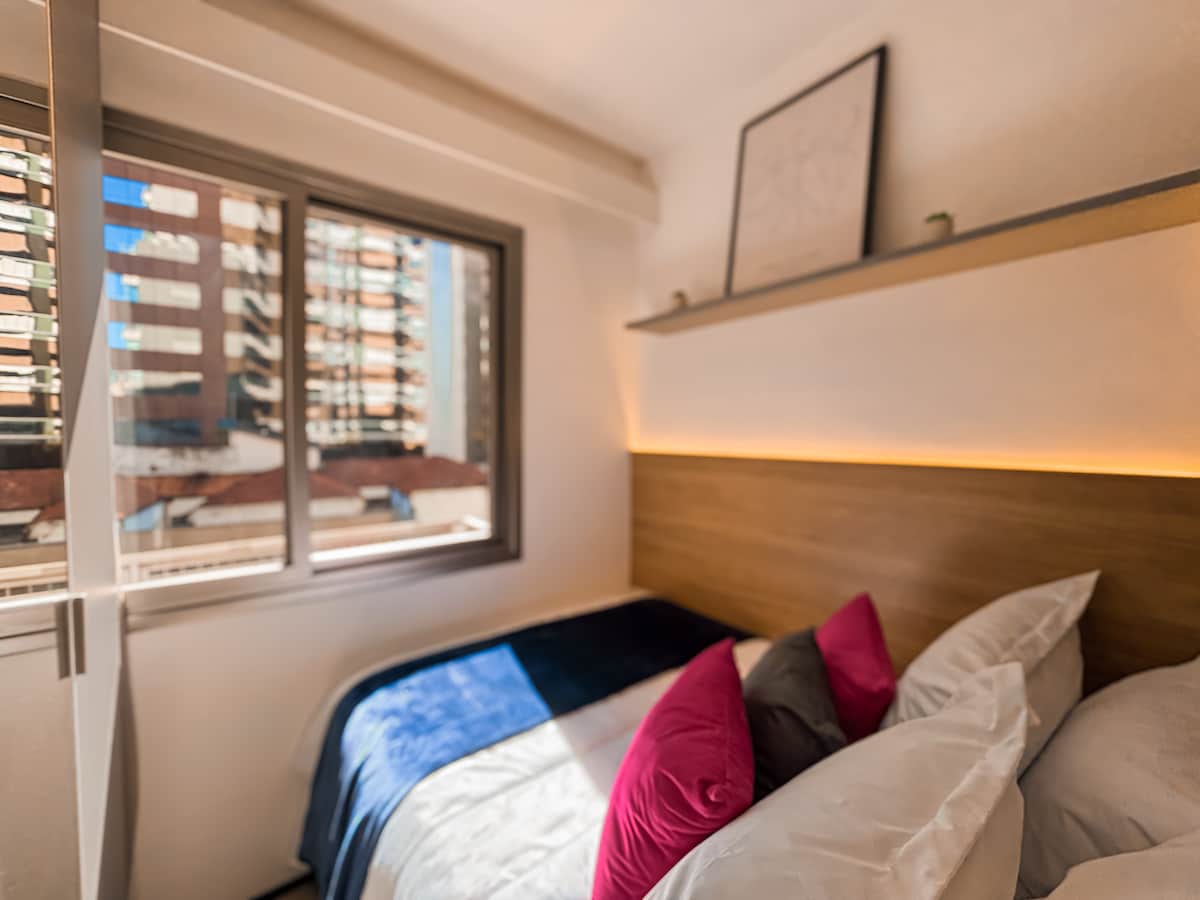 The Flat Nobile is complete and located in the heart of Jardins - at Al. Campinas, in the corner of Al. Santos, only 1 block away to Paulista Ave. It has 30m2. Well-decorated w/ living room and bedroom, it has 1 Queen bed (can be converted into 2 single beds) and can accommodate up to 4 people. It has a sofa bed / Wi-Fi / TV, AC, equipped kitchen, desk table, restaurants in the first floor and 24h room service. It has a swimming pool, gym, laundry, parking and daily cleaning service.