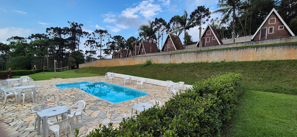 Um chalé que recebe todo o frescor da Serra da Cantareira. Tem um pavimento térreo, encravado numa enorme pedra, onde está uma sala, o banheiro e a cozinha. No pavimento intermediário há o quarto, provido de varanda, de onde se vê boa parte da chácara e de onde se sente o frescor da mata. O pequeno sótão ainda não está disponibilizado. Na outra parede foi adaptada uma porta, para ter acesso à vista de trás do chalé; vê-se uma bela montanha e o gramado todo. Dedetizado em 28/03/2026