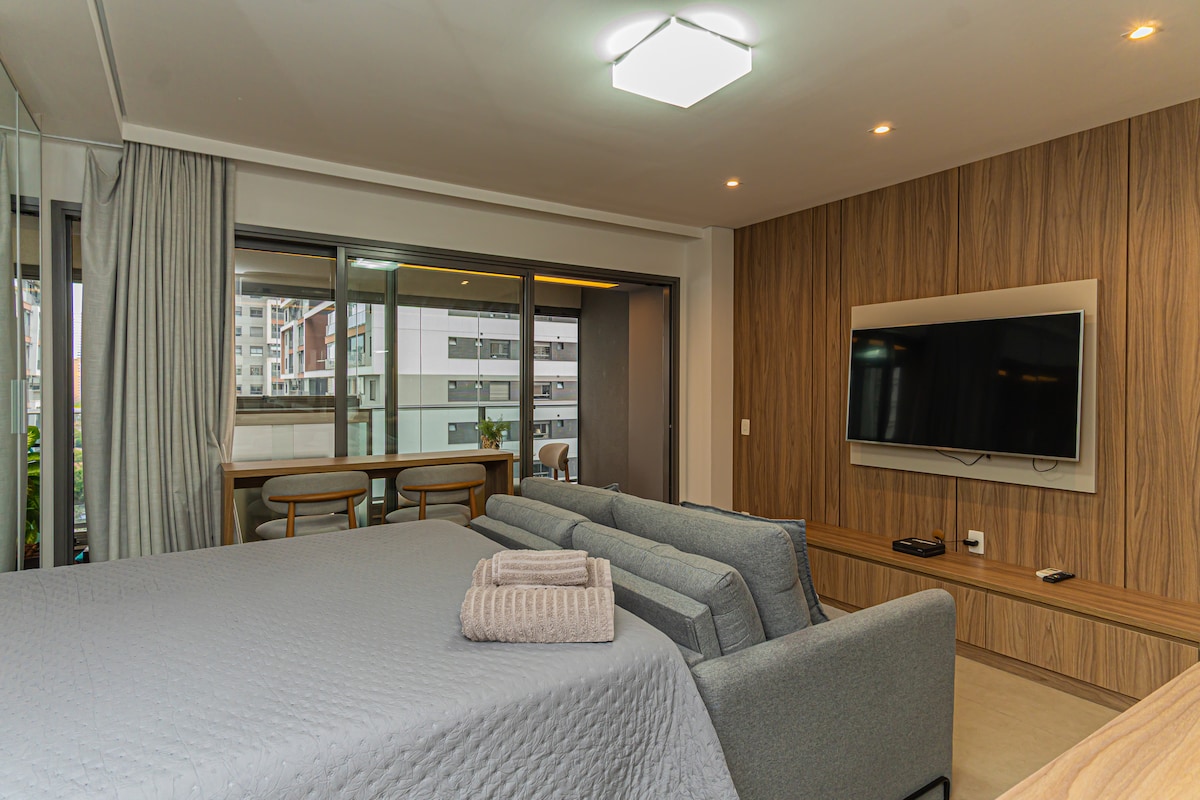 Super comfortable and cozy 42m2 studio with Queen Size bed. Privileged location in an area full of services, hospitals, restaurants, and colleges. Between Paulista Avenue and Ibirapuera Park. Perfect for both tourism and work. Wonderful view and a breathtaking sunset at the infinity pool!