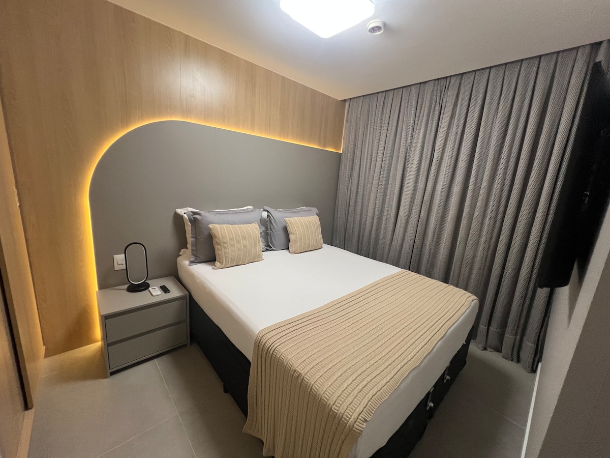 Apto 44m Nascente Quarto: Cama Queen + enxoval completo/Ar Condicion/Tv 50"/Guarda roupa/Cortina black out/corta luz/Proteção de tela na janela/Espelho Banheiro: Secador de Cabelo Sala: Ar Condicion/Sofá Cama 1.38 x 2.12m/Wifi 590mgbt/Tv 65"/Área de trabalho + cadeira/Mesa com cadeiras para refeições Cozinha: Geladeira/Purificador de água/Cooktop/Forno/Microondas/Air Fryer/Sanduicheira/Liquidificador/Panelas/Talheres/Ferro e tábua de passar/Vaporeto Extintor de Incêndio Varanda: Proteção de tela